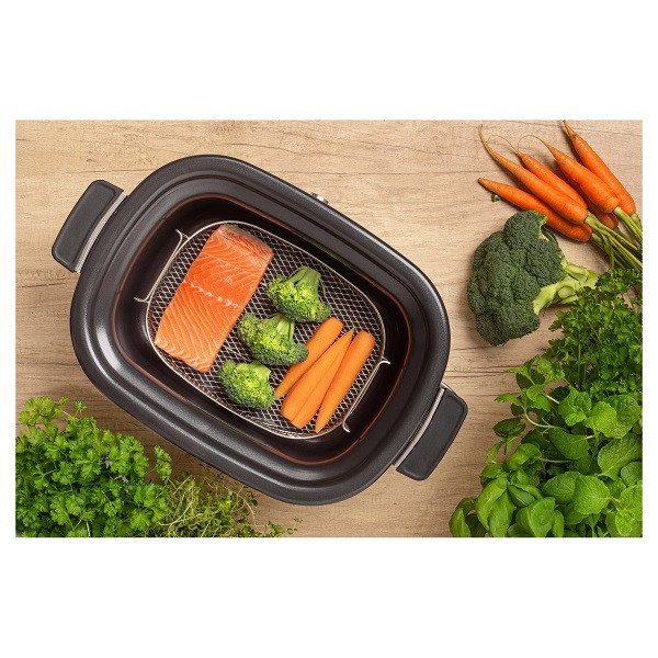 سایر اقلام همراه محصول محتویات موجود: آرام پز با قابلمه و درب، قابلمه بخارپز و توری استیل ضد زنگ، سینی پخت، دستکش فر توان، دفترچه راهنما محصول