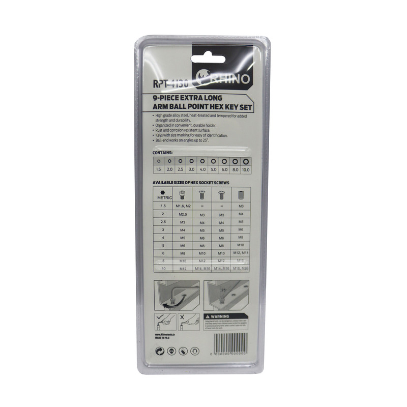 | سایر توضیحات | - آچار آلن شش گوش ( شش پر ) رینو - مجموعه 9 عددی - دارای 9 عدد آچار آلن بلند در سایز های : 1.5 - 2 - 2.5 - 3 - 4 - 5 - 6 - 8 - 10 میلی متر - جنس : کروم وانادیوم با مقاومت بالا |