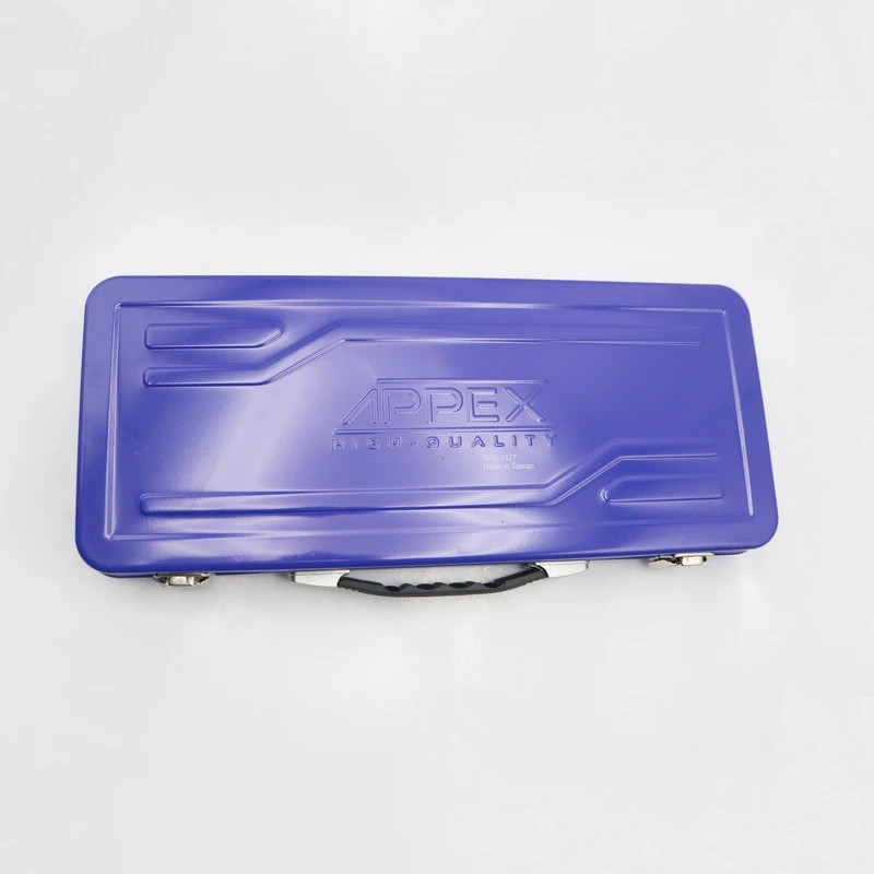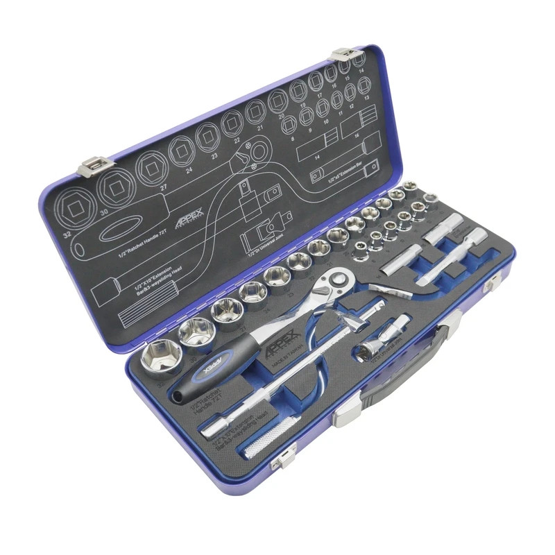 جعبه بکس برند اپکس 27 پارچه از سایز 8 تا 32 دارای دسته هندلی و کشویی ولغلغه وکمک و بکس شمع 16و21 ساخت تایوان درایو1/2 شش پر جغجغه 72 دنده که بسیار روان است که در جعبه ای فلزی شیک و محکم تعبیه شده است