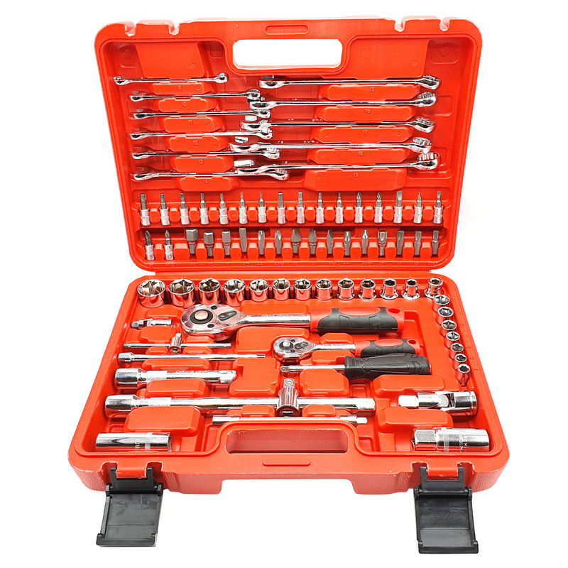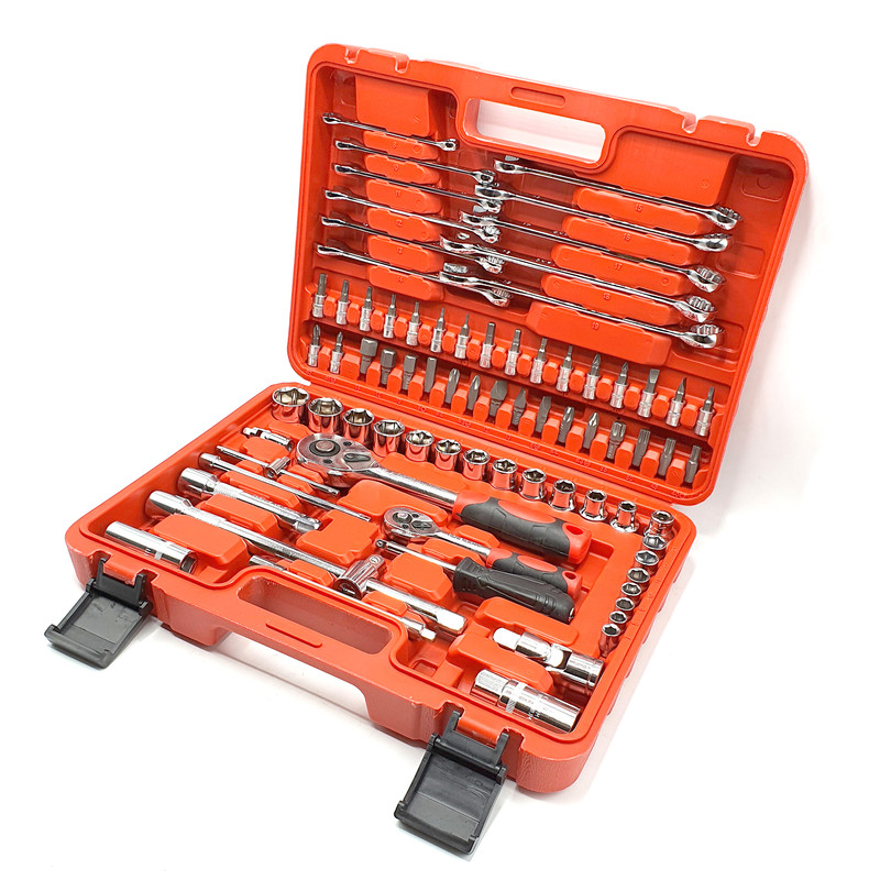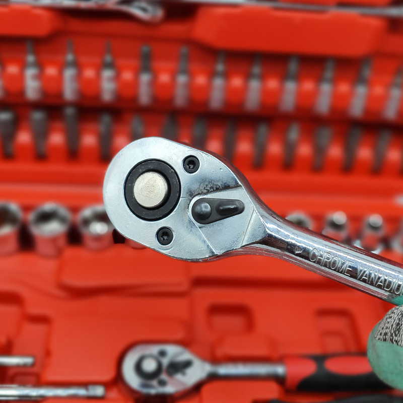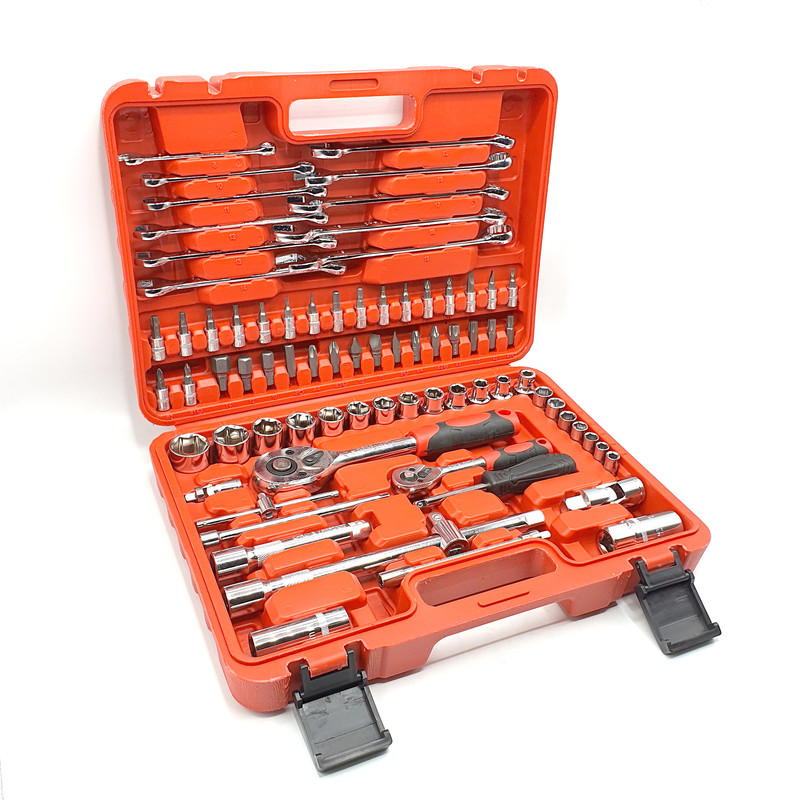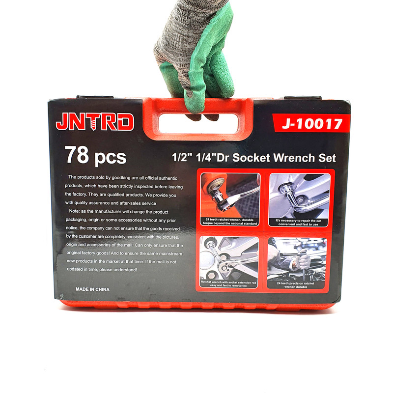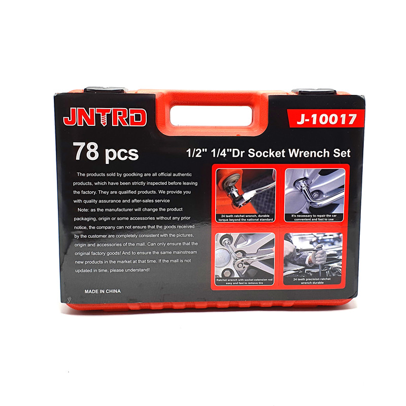 | اقلام همراه | دارای 78 عدد انواع بکس شامل 11 عدد آچار از سایز 8، 10، 11، 12، 13، 14، 15، 16، 17، 18، 19 میلیمتر می باشد x 12 عدد بکس درایو 1/2 اینچ شامل سایزهای 8، 10، 12، 13، 14، 15، 16، 17، 18، 19، 20، 22، 24 می باشد x 7 عدد بکس درایو 1/4 اینچ شامل سایزهای 7، 8، 9، 10، 11، 12، 13 میلیمتر می باشد. xدارای انواع کمکی لقلقی کشویی و ... در سایزها مختلف است. xدارای 33 عدد انواع نوک پیچگوشتی و بکس نوک پیچگوشتی دار می باشد |