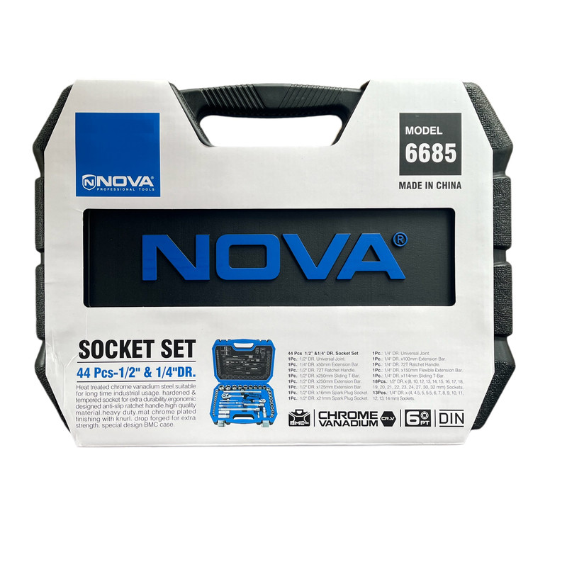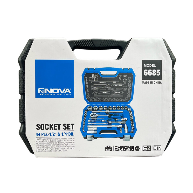 یکی از کامل ترین جعبه بکس های تولید شده توسط مجموعه نووا که پاسخگو تمامی نیاز کاربران خانگی و حرفه ای می باشد، جعبه بکس 1/2 و 1/4 اینچ 44 پارچه مدل 6685 است که از مقاومت ، کیفیت بسیار خوب و طول عمر بالایی برخوردار بوده و برای فعالیت های سنگین صنعتی ابزاری مناسب به شمار می رود. این محصول ساخت کشور چین بوده و شامل 18 عدد سوکت های 1/2 اینچی و 13 عدد سوکت های 1/4 اینچی است که به دلیل تنوع بالا در سایز سوکت ها، شما را از داشتن جعبه بکسی دیگر بی نیاز می کند. بدنه تمامی بکس ها از روکش کروم مات بهره مند بوده که موجب شده از مقاومت بسیار خوبی در برابر خوردگی و زنگ زدگی برخوردار شود.