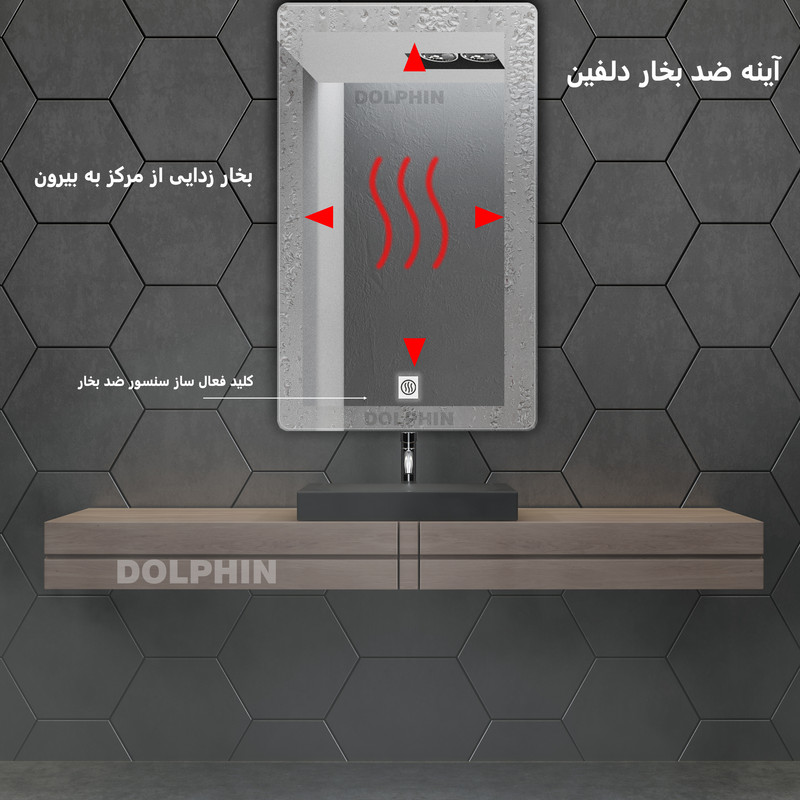 آینه ضد بخار دلفین مدل HT-60x70-R . یکی از مشکلات آینه ها در فضای رطوبتی مثل حمام بخار گرفتگی آن است که مانع استفاده از آینه میشود.آینه ضد بخار دلفین دارای پد حرارتی در پشت اینه است که پس از فعال کردن دکمه لمسی آن بخار سطح اینه را از بین میبرد.این پد حرارتی توسط اداپتور متصل به آن قابلیت اتصال به برق شهری را دارد .توجه داشته باشید که مانند تمام وسایل برقی آب را مستقیم به روی قظعات برقی نریزید. آینه به کار رفته از نوع سوپرکلیر با پوشش 2 لایه است که مقاومت آینه را در برابر عوامل محیطی مثل رطوبت بالا میبرد. تکنولوژی فلوت (FLOAT) به کار رفته در تولید آینه باعث از بین رفتن هر گونه موج و همچنین بالا رفتن شفافیت آن شده است. نصب آینه توسط پروفیلهای متصل به پشت آن توسط پیچ و رولپلاک (همراه کالا) انجام میپذیرد که کاملاً محکم و ایمن هستند.