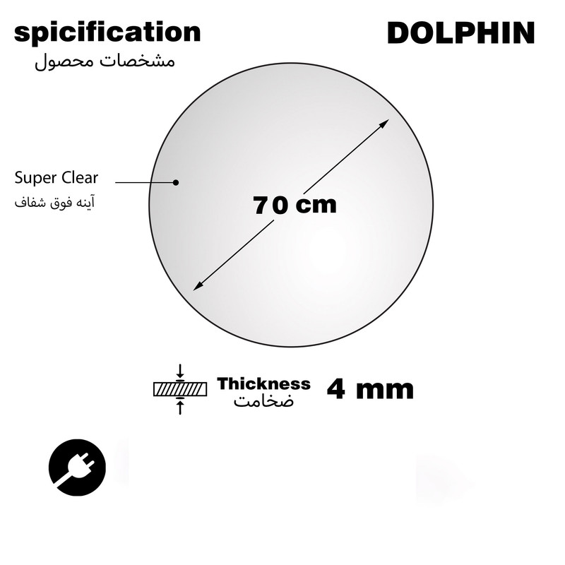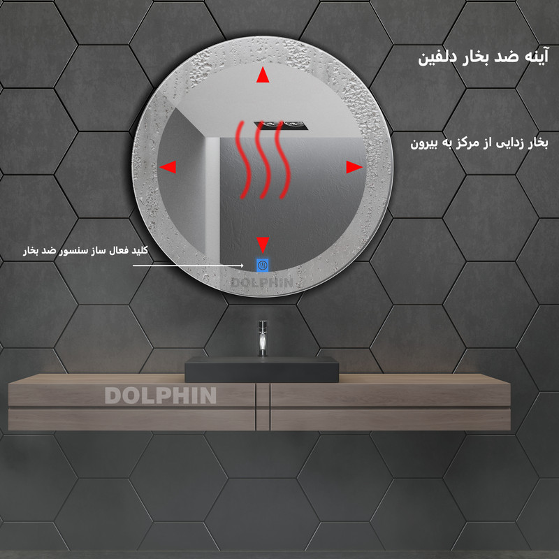آینه ضد بخار دلفین مدل HT-Q-70 . یکی از مشکلات آینه ها در فضای رطوبتی مثل حمام بخار گرفتگی آن است که مانع استفاده از آینه میشود.آینه ضد بخار دلفین دارای پد حرارتی در پشت اینه است که پس از فعال کردن دکمه لمسی آن بخار سطح اینه را از بین میبرد.این پد حرارتی توسط اداپتور متصل به آن قابلیت اتصال به برق شهری را دارد .توجه داشته باشید که مانند تمام وسایل برقی آب را مستقیم به روی قظعات برقی نریزید. آینه به کار رفته از نوع سوپرکلیر با پوشش 2 لایه است که مقاومت آینه را در برابر عوامل محیطی مثل رطوبت بالا میبرد. تکنولوژی فلوت (FLOAT) به کار رفته در تولید آینه باعث از بین رفتن هر گونه موج و همچنین بالا رفتن شفافیت آن شده است. نصب آینه توسط پروفیلهای متصل به پشت آن توسط پیچ و رولپلاک (همراه کالا) انجام میپذیرد که کاملاً محکم و ایمن هستند.