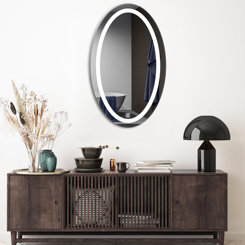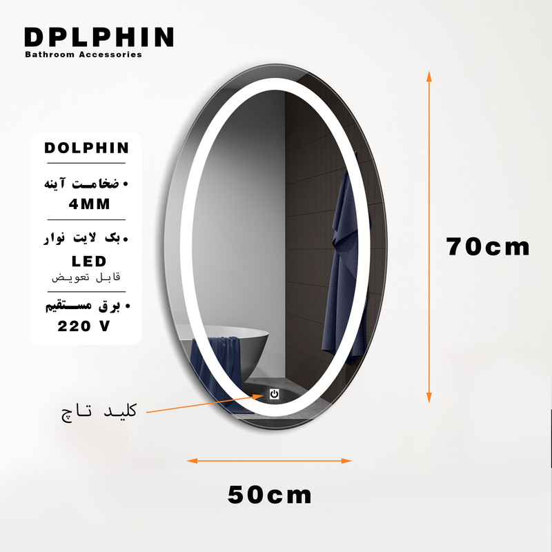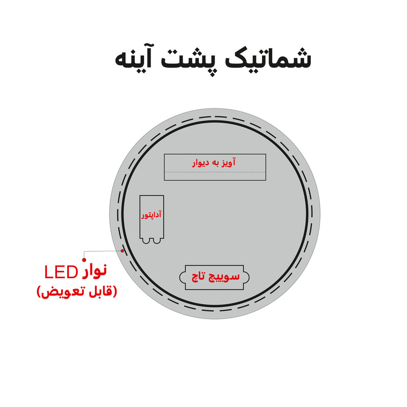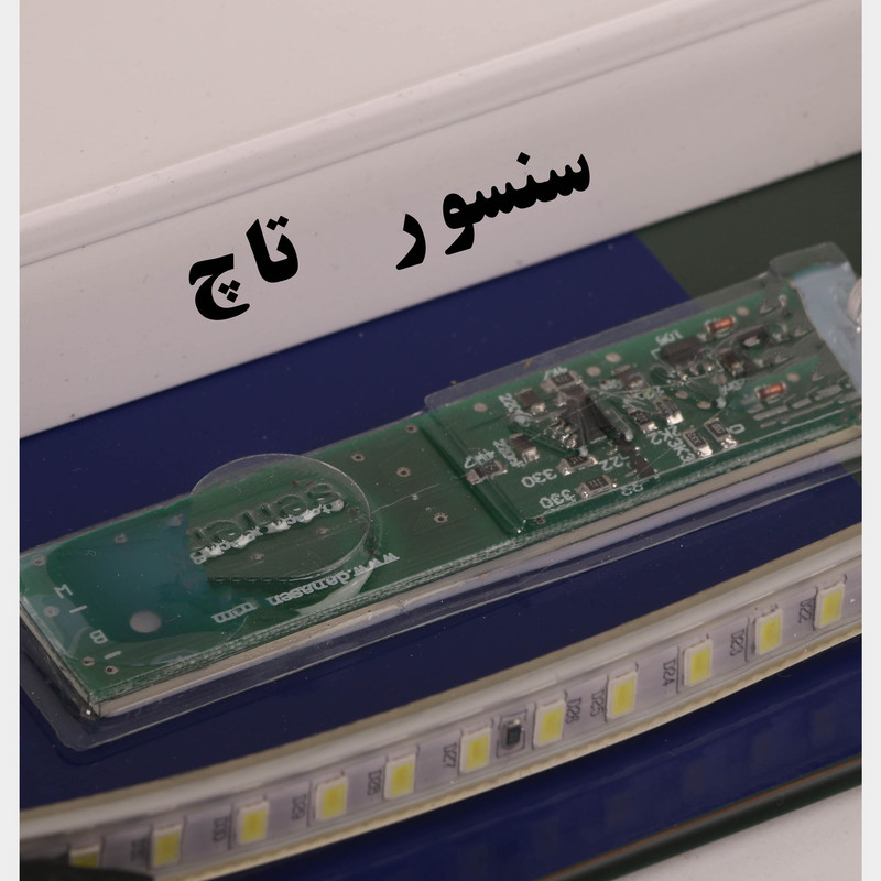 این محصول در دور رنگ نوری مهتابی و آفتابی قابل انتخاب میباشد. سنسور تاچ مونتاژ شده روی آینه بسیار حساسیت بالایی دارد و بهمحض برخورد دست با آن روشن و خاموش میشود. نور آبیرنگی هنگام خاموش شدن نوار ال دی دور سنسور روشن میشود که علاوه بر زیبایی، هنگام خاموش بودن محیط پیداکردن کلید را سادهتر مینماید. شیشه بهکاررفته در ساخت آیینه دارای ضخامت 4 میلیمتر بوده و از نوع سوپر کریستال میباشد. همچنین آینه با تکنولوژی فلوت تولیدشده که هیچ موج و زدگی را در آن پیدا نخواهید کرد و درنهایت با دولایه رنگ جیوه پشت آینه پوشیده شده تا در محیطهای رطوبتی مقاومت بیشتری داشته باشد. نصب اینه بوسیله پیچ و رولپلاک همراه کالا انجام میشود. یک 2 شاخه و یک ترمینال به همراه سیم اضافه همراه کالا قرار داده شده که مصرف کننده بتواند هم بصورت مستقیم چراغ آینه را به 2 شاخه وصل کند ویا به سیم بالای دستشویی متصل کد. این محصول برای استفاده در حمام و دستشویی، در اتاق ها بصورت آینه دکوراتیو و همچنین ارایشگاهها پیشنهاد میشود.