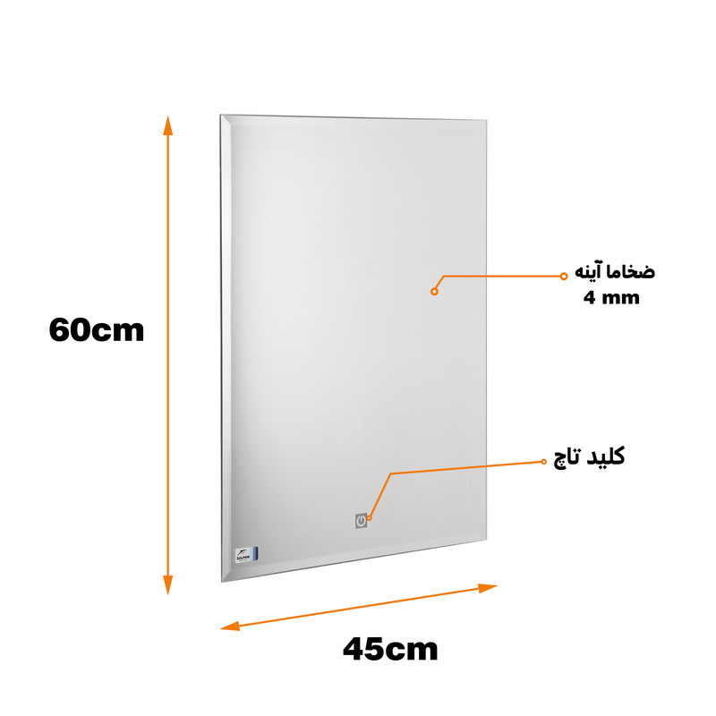 این محصول در دور رنگ نوری مهتابی و آفتابی قابل انتخاب میباشد. سنسور تاچ مونتاژ شده روی آینه بسیار حساسیت بالایی دارد و بهمحض برخورد دست با آن روشن و خاموش میشود. نور آبیرنگی هنگام خاموش شدن نوار ال دی دور سنسور روشن میشود که علاوه بر زیبایی، هنگام خاموش بودن محیط پیداکردن کلید را سادهتر مینماید. شیشه بهکاررفته در ساخت آیینه دارای ضخامت 4 میلیمتر بوده و از نوع سوپر کریستال میباشد. همچنین آینه با تکنولوژی فلوت تولیدشده که هیچ موج و زدگی را در آن پیدا نخواهید کرد و درنهایت با دولایه رنگ جیوه پشت آینه پوشیده شده تا در محیطهای رطوبتی مقاومت بیشتری داشته باشد. نصب اینه بوسیله پیچ و رولپلاک همراه کالا انجام میشود. یک 2 شاخه و یک ترمینال به همراه سیم اضافه همراه کالا قرار داده شده که مصرف کننده بتواند هم بصورت مستقیم چراغ آینه را به 2 شاخه وصل کند ویا به سیم بالای دستشویی متصل کد. این محصول برای استفاده در حمام و دستشویی، در اتاق ها بصورت آینه دکوراتیو و همچنین ارایشگاهها پیشنهاد میشود.