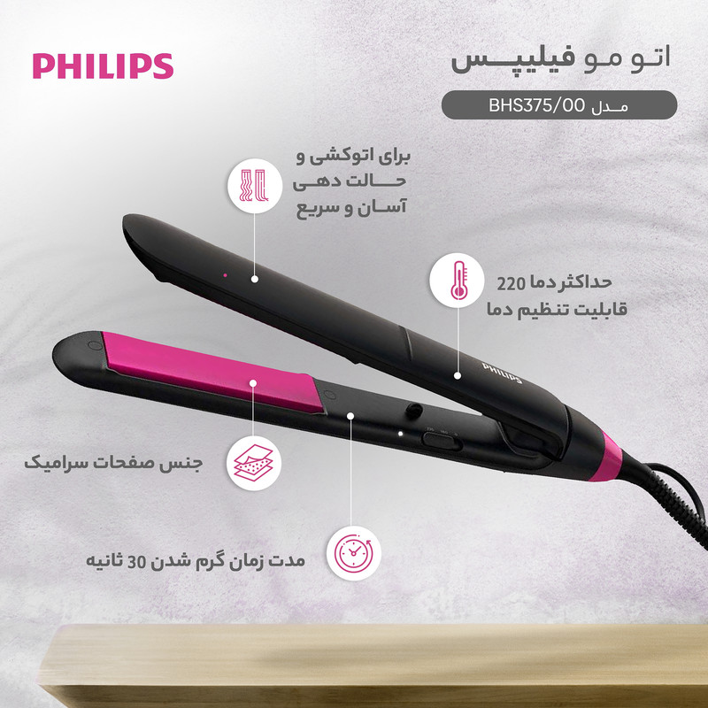 اتو مو فیلیپس مدل BHS375/00 به طور اختصاصی برای اتوکشی و حالت دهی آسان و سریع طراحی شده است که این مهم توسط صفحه های کراتینی و 2 تنظیم مختلف دمایی ممکن می شود. تکنولوژی ترمو پرفکت این اتو، گرما را در تمام سطح صفحات پخش و از اینکه موی شما در معرض گرمای بیش از حد قرار بگیرد جلوگیری میکند. ویژگی یونیک و صفحات سرامیکی کراتینی این دستگاه باعث میشود که شما موهایی درخشان و بدون وزی داشته باشید. دمای قابل تنظیم اتو مو فیلیپس مدل BHS375/00 در دمای 180 و 230 درجه سانتی گراد است. صفحات 100 میلی متری این اتو، زمان اتوکشی را به حداقل می رساند و در زمان صرفه جویی میشود همچنین 30 ثانیه پس از روشن کردن، دستگاه قابل استفاده میشود. در نهایت باید به قفل ایمنی دستگاه اشاره کرد که آن را از نظر ایمنی نیز در جایگاه برتری قرار میدهد.