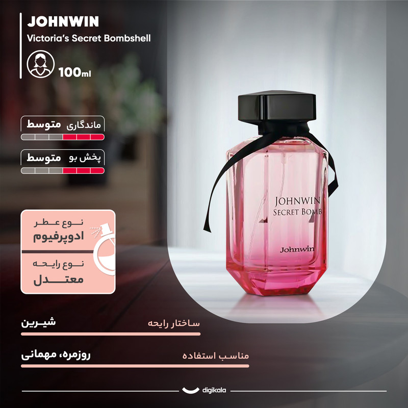 عطر ادکلن زنانه ویکتوریا سکرت بامب شل (Johnwin Victoria Secret Bombshell) با رایحهای خنک و شیرین، انتخابی جذاب و متفاوت برای بانوان است. این عطر که در سال 2010 معرفی شد، با ترکیب رایحههای گلی و میوهای، حس طراوت، شادابی و انرژی را به همراه دارد و گزینهای مناسب برای استفاده در روزهای گرم سال محسوب میشود.