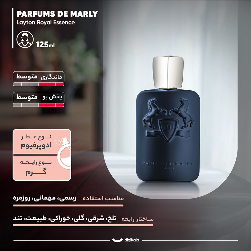 برند مشهور «پرفیوم دو مارلی» (Parfums de Marly) سری معروف «رویال اسنس» (Royal Essence) را در سال 2016 با معرفی یک عطر جدید کاملتر کرد. این ادو پرفیوم با نام «لِیتون» (Layton) شناخته میشود. Layton با حال و هوای شرقی و گلیاش برای استفادهی مشترک آقایان و بانوان ساخته شده است. عطر موردبحث برای استفاده در تمامی فصول سال پیشنهاد میشود. با توجه به حجم 125 میلیلیتری Layton تا مدت زیادی از خرید عطر جدید بینیاز خواهید شد. این عطر از شاهکارهای عطرساز مشهور و کاربلد «حمید مرآتی کاشانی» (Hamid Merati-Kashani) است. بطری Layton بسیار کلاسیک و در همان پلتفرم قبلی عطرهای پرفیوم دو مارلی ساخته شده است. این بطری مشکیرنگ بهخوبی در دست جا میشود. روی شیشه نشان زیبای پرفیوم دو مارلی به شکل برجسته کار شده است. درپوش بطری به رنگ نقرهای است و درخشش خیرهکنندهای در نور دارد. با اسپری کردن Layton روی پوست و محل نبضتان بوی اسطوخودوس، نارنج، سیب و پرتقال ماندارین خواهید شد. این ترکیب شیرین انرژی و شادی را به شما هدیه میکند. پس از مدتی نتهای میانی جای نتهای آغازی را میگیرند. نتهای میانی از ترکیب گل بنفشه، یاسمین و شمعدانی ساخته شدهاند. بوی این گلها طراوت و انرژی مثبت را به شما و اطرافیانتان هدیه میکند. پس از مدتی طولانی نتهای پایانی از راه رسیده و جایگزین نتهای میانی میشوند. این نتها از چوب گایاک، گیاه پاتچولی، چوب صندل، هل، وانیل و فلفل ساخته شدهاند. بوی این نتهای تند و شرقی هیجان شما را بیشتر میکند. خرید عطر پرفیوم دو مارلی Layton با توجه به قابلیت استفاده برای آقایان و بانوان، حجم 125 میلیلیتری، پخش بوی قوی، ماندگاری بالا و برند شناختهشدهاش برای شما بسیار لذتبخش خواهد بود. با استفاده از این عطر در طول روز انرژی و هیجان خاصی خواهید داشت.