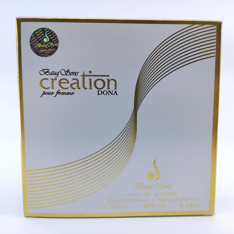 نت آغازین عطر کریشن دونا مرکب از رایحه ترنج بوده و بعد از گذشت چند دقیقه و از بین رفتن این روایح میتوان روایح نت میانی که از گل رز بلغاری و زنبق تشکیل شده است را استشمام نمود و در نهایت نت پایانی مرکب از روایح نعناع هندی، چرم و وانیل است.مدت زمان ماندگاری این عطر مناسب بوده به گونهای که بعد از گذشت چند ساعت نیز میتوان روایح آن را استشمام نمود. عطر Creation Dona محصولی از برند مشهور باوگ سانز و ساخت کشور امارات است.