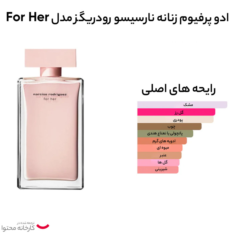 بیشتر خانمها دوست دارند از عطری استفاده کنند که کسی در اطرافشان آن را نداشته باشد یا دستکم خیلی تکراری نباشد. برند «نارسیسو رودریگز» (Narciso Rodriguez) با طراحی و تولید یکی از همین عطرها که «نارسیسو رودریگز فور هر» (Narciso Rodriguez for Her)، خانمها را در رسیدن به هدفشان یاری کرده است. این ادو پرفیوم 100 میلیلیتری در سال 2006 معرفی شد. طراحی و فرمولاسیون این عطر توسط عطرسازهای معروفی چون «کریستینا نایگل» (Christine Nagel) و «فرانسیس کورکجیان» (Francis Kurkdjian) انجام شده است. روی بطری، نشان تجاری narciso rodriguez و زیر آن مدل For Her با رنگ مشکی چاپشده و دیده میشوند. مایع صورتیرنگ درون بطری از روی شیشهی شفاف آن بهخوبی دیده میشود. در بطری با رنگ صورتیاش هارمونی رنگی قشنگی را با مایع درون شیشه ایجاد کرده است. فور هر برای تمامی فصول سال قابلاستفاده است؛ اما برای تابستان پیشنهاد نمیشود. با اولین اسپری از Narciso Rodriguez for Her روی پوست و محل نبض یا لباستان متوجه بوی هلو و گل رز خواهید شد. این ترکیب میوهای-گلی و شیرین، در شما و کسانی که این بو را استشمام میکنند انرژی مثبت و هیجان فوقالعادهای را ایجاد میکند. با گذشت زمان، متوجه تغییر مسیر نتهای آغازی بهسوی نتهای میانی خواهید شد. این نتها از مشک و عنبر تشکیلشدهاند. این ترکیب گرم و شیرین، علاوه بر هیجان و شادی، انرژی و آرامش درونی را هم به شما منتقل میکند. در ادامه و با گذشت زمان متوجه جانشینی نتهای پایانی بهجای نتهای میانی خواهید شد. این نتها از ترکیب چوب صندل و گیاه پاتچولی تشکیلشدهاند. این ترکیب تند و شیرین، آرامش و تمرکز را به شما هدیه میدهد. ادو پرفیوم زنانهی Narciso Rodriguez for Her با توجه به بوی شیرین و گرمش برای روزهای بهاری، پاییزی و زمستانی بسیار مناسب است. خرید عطر Narciso Rodriguez for Her با در نظر گرفتن بوی ماندگار و خاص، کیفیت بالای عطر و شیشه و برند ارزشمند و معتبرش، بسیار رضایتبخش و بهیادماندنی خواهد بود. این عطر برای هدیه دادن هم بسیار مناسب است.