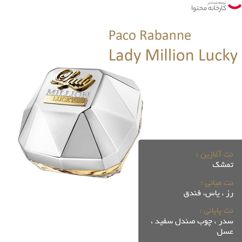 این ادو پرفیوم یکی از جدیدترین محصولات برند پاکو رابان، از مجموعه million است. اولین سری از این مجموعه در سال 2008 با معرفی عطر مردانه 1Million و در سال 2010 عطر زنانه Lady Milllion شروع به کار نمود و در آخرین طراحی این مجموعه در سال 2018، 1Miliion Lucy برای مردان و Lady million LUcky. ادو تویلت ادو پرفیوم پاکو رابان مدل Lady Million Lucky، عطری است زنانه و خوشبو با ساختاری میوه ای و گلی. رایحه ابتدایی عطر با ترکیب رایحه کاملا مشخص و قدرتمند میوه تمشک و همراهی رایحه مشخصی از گلها خصوصا رز و کمی یاس شروع میشود که حسی زنانه و دلپذیر دارد. با گذر زمان رایحه میوه ای ملایم شده و همزمان رایحه گل رز قویتر میشود. رایحه میانی و پایه عطر رایحه ای شیرین، گلی، پودری مانند و میوه ای است که تلخی متعادلی از چوبها نیز با آنها ترکیب شده تا رایحه را سنگین تر و جذابتر نماید.