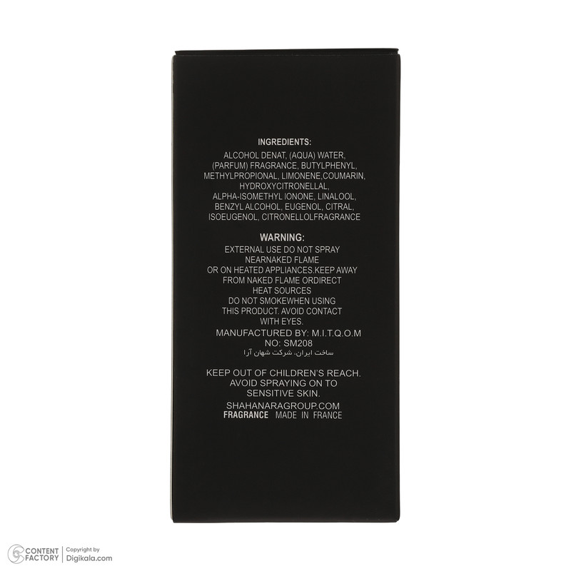 | نت آغازین | ترنج ، فلفل اسانس میانی نعناع هندی ، اسطوخودوس ، خس خس ، شمعدانی ، لامی ، فلفل صورتی ، فلفل سیچوان اسانس پایه سدر ، لابدانیوم، آمبروکسان |