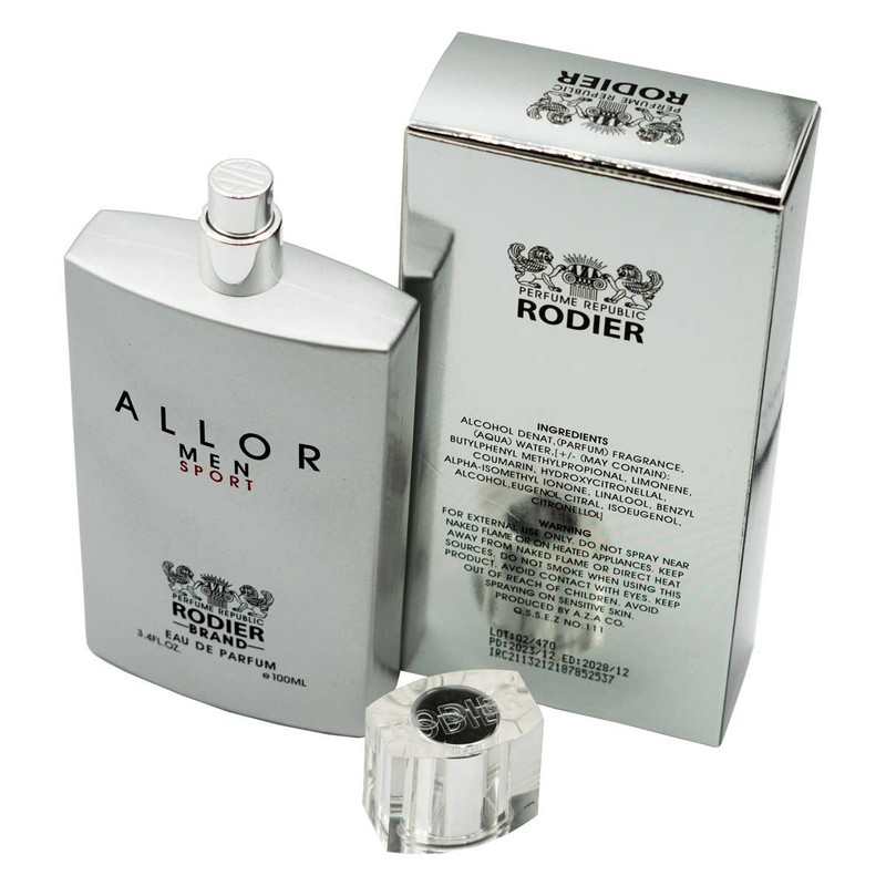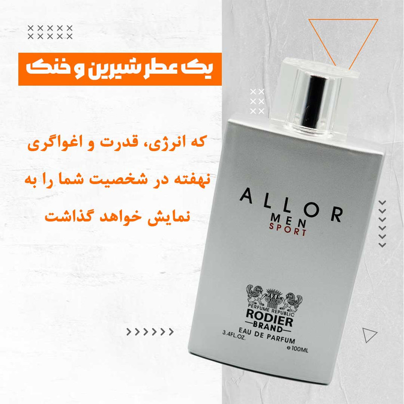 ادكلن Allor Men Sport از برند خوشنام رودیر به دلیل رایحه ی شاداب و سرزنده ای که دارد در هر جمعی توجه ها را به سوی شما جلب خواهد کرد این ادکلن حاوی رايحهي تشديد شده اي از خنكي است نماینگر اغواگري مردانه است و بازتاب شخصیت های پرانرژي و فعال ميباشد. این رایحه در دنیا به سلامت جسمی ارتباط داده میشود. رايحه ادكلن Allor Men Sport Rodier برگرفته از رايحه ادكلن Allure Homme Sport از برند Chanel ميباشد. این ادكلن داراي رايحه با طراوت مركبات و آب درياهاست كه با تندي ادويهها و چوبهاي تند و تيز ادغام شده است همین ترکیبات می تواند ذهنیتی کلی از آنچه خواهید داشت به شما ارائه کند. شادابی حاصل از بوی مرکبات که روح را جلا می دهد در ترکیب با وسعتی که بوی دریا به ذهن می کشاند و جسارتی که تندی بوی ادویه از خود به جا می گذارد همگی با قدرت و صلابت بوی چوب خاطره ای خوش از شما در ذهن هر مخاطبی بهع جا خواهد گذاشت. این عطری است که با آن میتوانید دیده شوید و شیوه حضور و پیچش های شخصیت خود را به نمایش بگذارید. بهترین اثر گذاری این عطر را می توانید در لباس های اسپرت رنگ های و نیمه رسمی و رنگ های روشن و اسپرت خواهید داشت. اگر شخصیت شوخ و پر جنب جوشی دارید. و این شما هستید که معمولا سر صحبت صحبت را باز می کنید و همچنین اگر می خواهید حالت تدافعی دیگران را خنثی کنید و صمیمیت بیشتری بدست آورید این عطر شماست. این عطر مناسب برای استفاده در طول روز در جلسات کاری، قرارهای عاشقانه و تایم های ورزش می باشد. بسته بندی سیلور این عطر مناسب برای هدیه دادن به آقایان خوش پوش و جنتلمن می باشد.