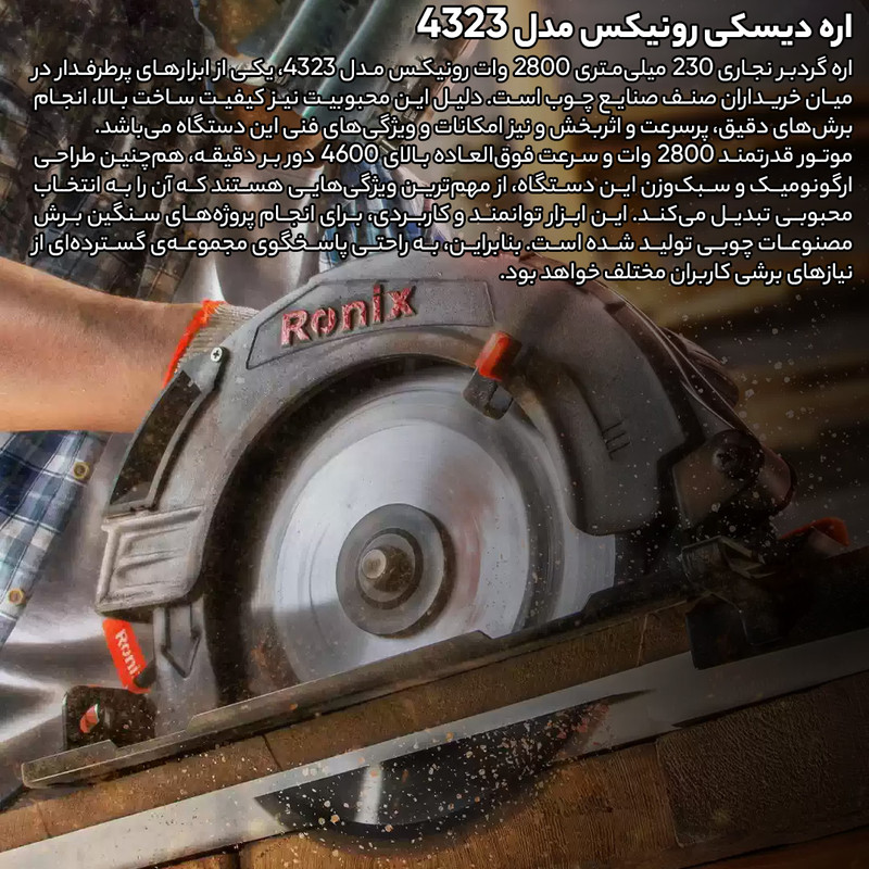 اره گرد بر مدل 4323 یکی از ابزارآلات شرکت رونیکس است و در بین خریداران محصولات این شرکت به عنوان یک ابزار کاربردی شناخته می شود. دلیل این محبوبیت امکانات و ویژگی های این دستگاه می باشد. از مهم ترین ویژگی های این وسیله می توان به موتور قدرتمند 2800 واتی و سرعت فوق العاده 4600 دور در دقیقه ای اشاره کرد.قطر صحفه این دستگاه 235 می باشد . اره گرد بر نجاری 235 میلی متری 4323 رونیکس، دارای موتوری با دوام بالا و قدرتی منحصر بفرد است که با برق 220 ولت به حرکت در می آید. حاصل کار این موتور که توان 2800 واتی دارد، سرعت چرخشی برابر 4600 دور در دقیقه است که برای انجام برش های دقیق، پر سرعت و اثر بخش کاملا کافی است. این ابزار نجاری توانمند و کاربردی برای انجام پروژه های سنگین برش مصنوعات چوبی تولید شده است؛ بنابراین می تواند به راحتی مجموعه گسترده ای از نیازهای برشی کاربران را پاسخ دهد.