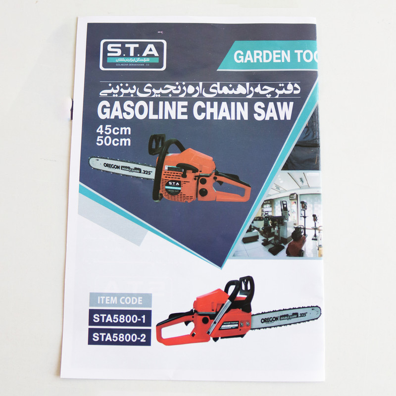 | سایر توضیحات | - اره زنجیری بنزینی اس تی ای مدل : 1-5800 STA - طول تیغه : 45 سانتیمتر - نوع موتور : دو زمانه تک سیلندر - دارای سیستم استارت سریع - دارای خنک کنندگی هوا - حجم موتور: 49.3 سی سی - قدرت موتور : 1.9 کیلو وات - سرعت در حالت بی باری : 3200 دور بر دقیقه - سرعت در حالت کار : 11800 دور بر دقیقه - حجم مخزن سوخت : 550 میلی لیتر - حجم مخزن روغن : 260 میلی لیتر - زنجیر و تیغه برش : اورگان - کاربراتور : والبرو - بدنه مستحکم و مقاوم - مجهز به زنجیر : (0/325 اینچی) با کیفیت بسیار بالا - وزن با کیف همراه: 8.400 کیلوگرم - وزن خالص : 5 کیلوگرم |