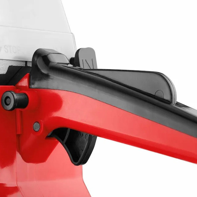 سیستم ترمز اضطراری در قسمت جلوی این اره، با قطع اتصال بین کلاچ و زنجیر از حرکت زنجیر در مواقع اضطراری جلوگیری میکند.