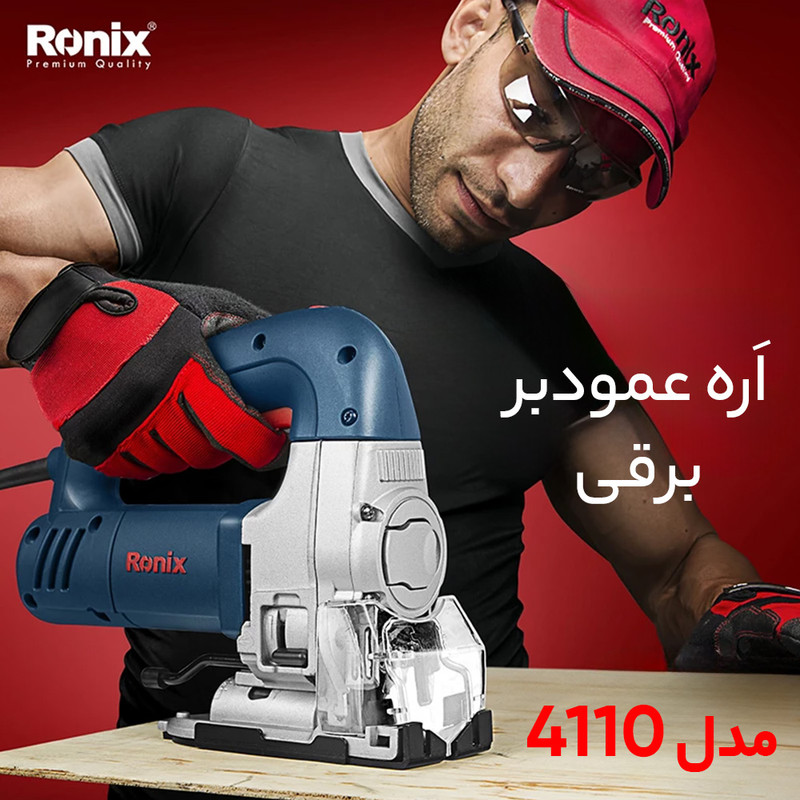 ارهی عمودبر مدل 4110 ساخت شرکت «رونیکس» (Ronix)است که با توان 600 وات کار میکند. این محصول برای برش قطعات چوب، نئوپان، لترون، HBF و MDF به کار میرود. همچنین برخی برشهای سبک فلزات با این دستگاه امکانپذیر است. این اره با داشتن ظرفیت برش تا 130 میلیمتر برای چوب و 10 میلیمتر برای فلزات برای مصارف خانگی و تجاری مناسب به نظر میرسد. در ساخت این دستگاه از موتوری با قدرت مناسب استفادهشده و کیفیت قابلقبولی در ساخت این دستگاه بهکاررفته است. این محصول قابلیت برش زاویه را هم دارد. همچنین برای جلوگیری از پخش شدن گردوغبار قابلیتی روی بدنهی 4110 در نظر گرفتهشده است. در ساخت موتور دستگاه، شاخصهای استاندارد CE اروپا را در نظر میگیرند. سرعت حرکت رفت و برگشتی تیغه تا 2500 بار در دقیقه میرسد. با استفاده از ولوم روی دسته امکان تنظیم سرعت در 6 حالت مختلف وجود دارد. برای این مدل، قابلیت برش تا زاویهی 45 درجه هم در نظر گرفتهشده است. اگر میخواهید از پخش شدن گردوغبار، خاکاره یا پلیسههای فلزی جلوگیری کنید، امکان اتصال این مدل به جاروی برقی یا مکندههای هوا - به کمک مبدل مخصوص که به همراه دستگاه در اختیار خریدار قرار میگیرد - وجود دارد. استفاده و کاربرد این دستگاه بیشتر در کارگاههای نجاری و یا در ساخت دکوراسیون چوبی است. اگر اره عمودبر 4110 را تهیه کردید، دقت کنید که در کیف محصول، علاوه بر دستگاه، یک آچار آلن (متصل به بدنهی دستگاه)، یک تیغه مخصوص برش چوب و دفترچهی راهنمای دستگاه هم باشند. ارهی عمودبر دستگاهی است که در آن تیغه در راستای عمود حرکت کرده و برش انجام میشود. اره عمود بر دارای تیغهی مخصوصی است که در دو نوع چوببر یا فلزبر تولید میشود. با اتصال تیغهی موردنظر و روشن کردن دستگاه، تیغه بهصورت عمودی حرکتی رفتوبرگشتی دارد.