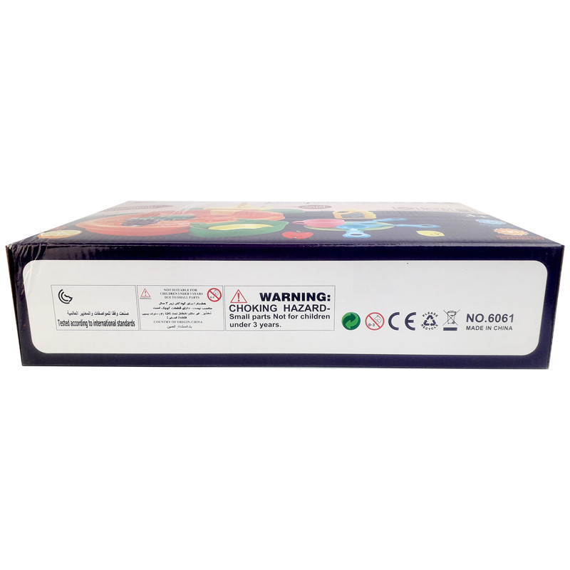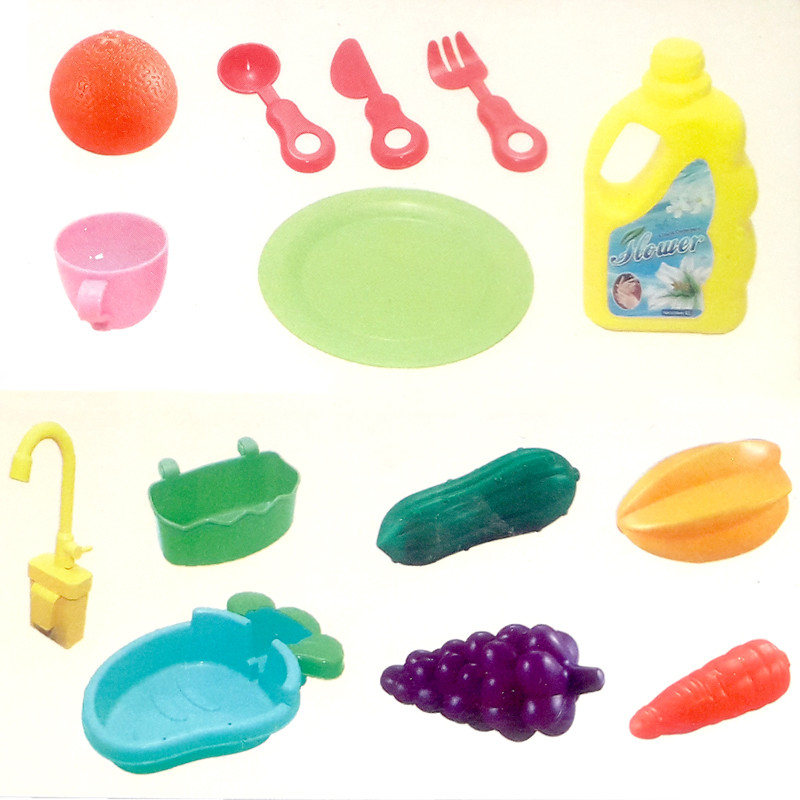 | اقلام همراه | فنجان و بشقاب و چاقو و چنگال و قاشق و مایع شوینده و 5 مدل میوه (همگی پلاستیکی و اسباب بازی) |