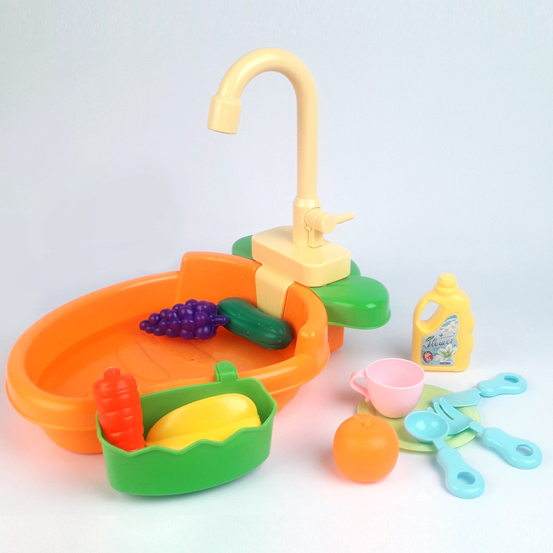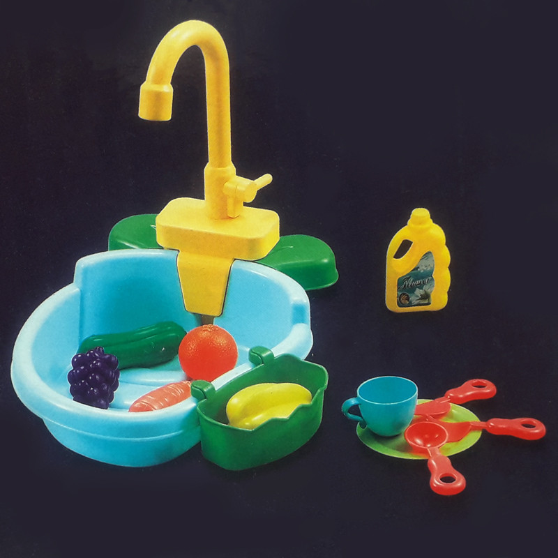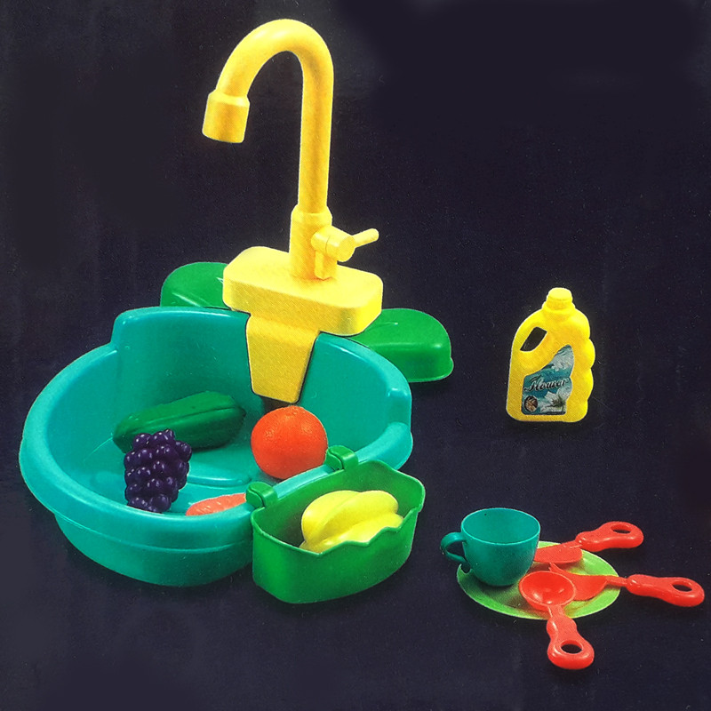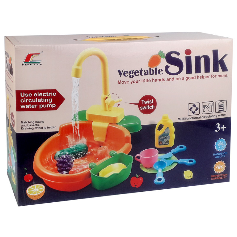 سینک ظرفشویی باتری خور با جریان آب واقعی میباشد. با دو باتری قلمی کار میکند که حتما باید تازه باشند تا پمپ کار کند. شیر گردان دارد و همراه با فنجان و بشقاب و چاقو و چنگال میباشد. همراه با 4 میوه و سبزیجات و یک دبه شوینده اسباب بازی میباشد. لگن زیر سینک را تا ارتفاع کافی پر آب کنید تا آب از شیر جریان پیدا کند (ارتفاع آب به حدی برسد که پمپ آب زیر شیر بتواند آب را بشکد در داخل خودش). با چرخاندن اهرم شیر شروع به کار میکند. ساخته شده از پلاستیک با کیفیت بالا میباشد. ابعاد حدود ۳۳ سانت عرض و ۲۸ سانت طول و ۲۸ سانت ارتفاع است. حتما پس از بازی آب خالی شود و کاملا خشک شود تا پمپ به مرور خراب نشود. به هیچ عنوان مو یا کاغذ و سایر مواردی که در پمپ گیر میکند در آب ریخته نشود در غیر این صورت پمپ از کار می افتد. توجه داشته باشید اگر باتری ضعیف باشد پمپ کار نمیکند. اگر بعد از مدتی بازی پمپ کار نکرد میتواند به دلیل طولانی باز بودن شیر و کم شدن باتری باشد.