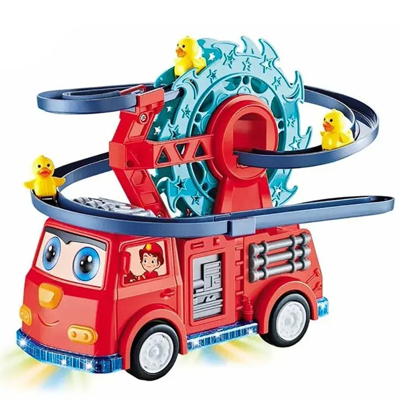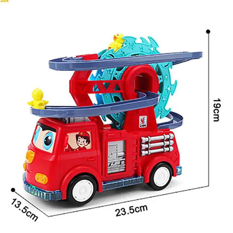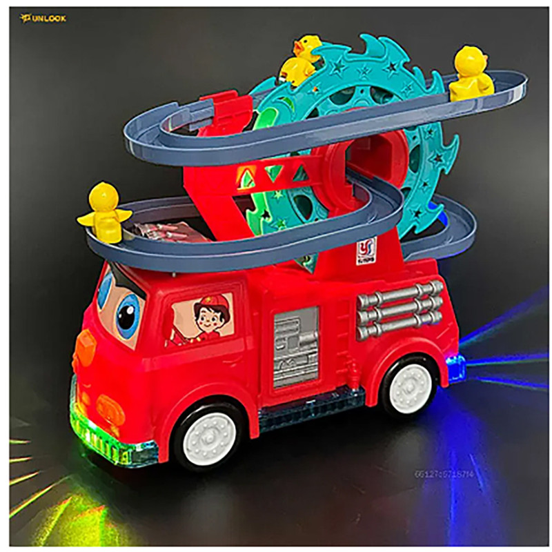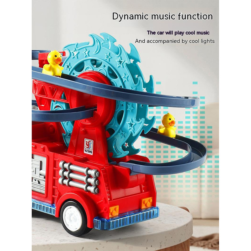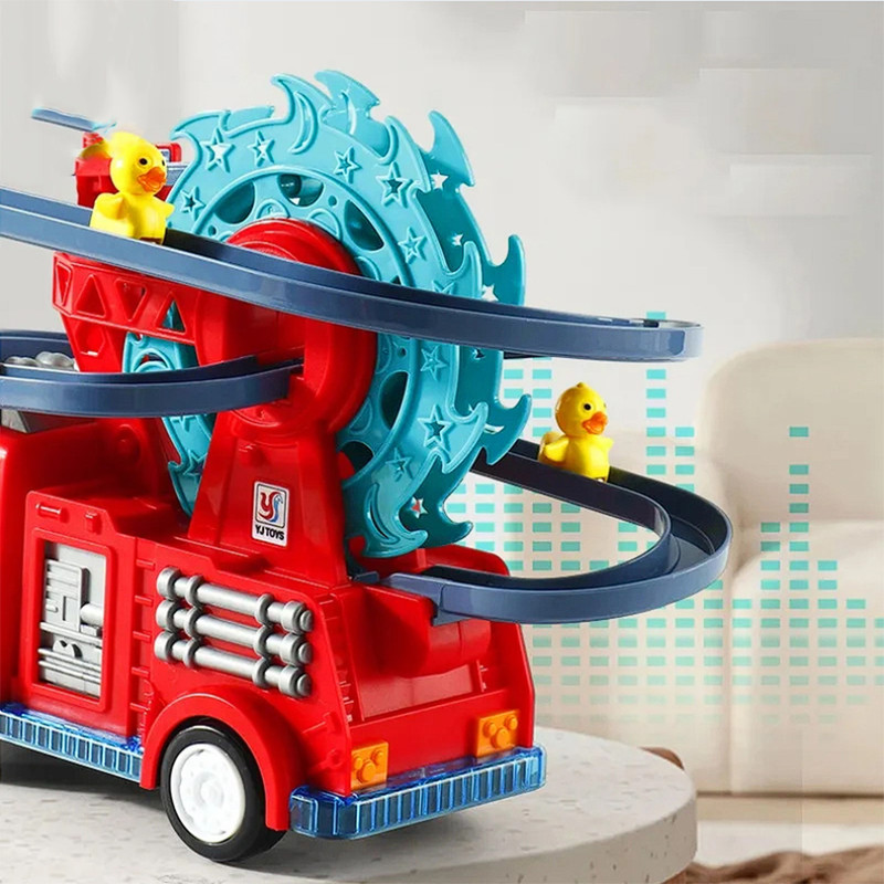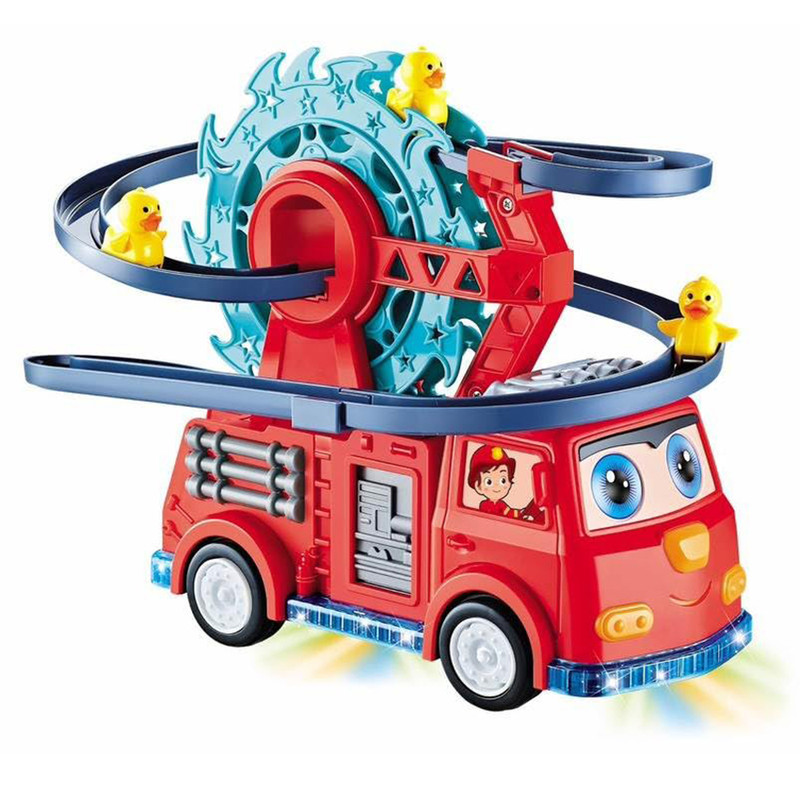 این محصول یک ماشین پله در طرح ماشین آتش نشانی می باشد که چندین عروسک اردک در مسیری که روی ماشین به صورت سرسره وجود دارد نصب می شود و اردک ها به صورت خودکار از پله ها بالا آمده و در مسیر سرسره حرکت می کنند و دوباره به نقطه اولیه بازمیگردند.این ماشین دارای چرخی در زیر ماشین است که که قابلیت چرخش 360 درجه دارد و هنگام برخورد با موانع تغییر مسیر می دهد.از دیگر ویژگی های این محصول نورپردازی سه بعدی و موسیقی متنوع، است که توجه کودکان را جلب کرده و آنها را مجذوب خود میکند.دیگر ویژگی این محصول حرکت کردن چشم های جلوی ماشین به هنگام روشن کردن می باشد.این محصول با داشتن بسته بندی مناسب برای کودکان بالای 3 سال می باشد و می تواند هدیه ای زیبا و جذاب برای کودکان عزیز شما باشد.