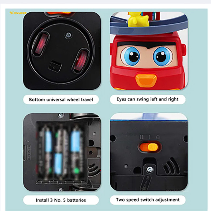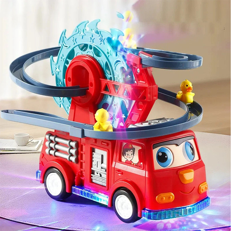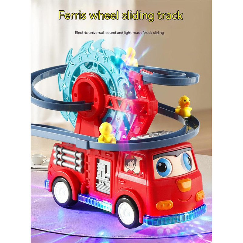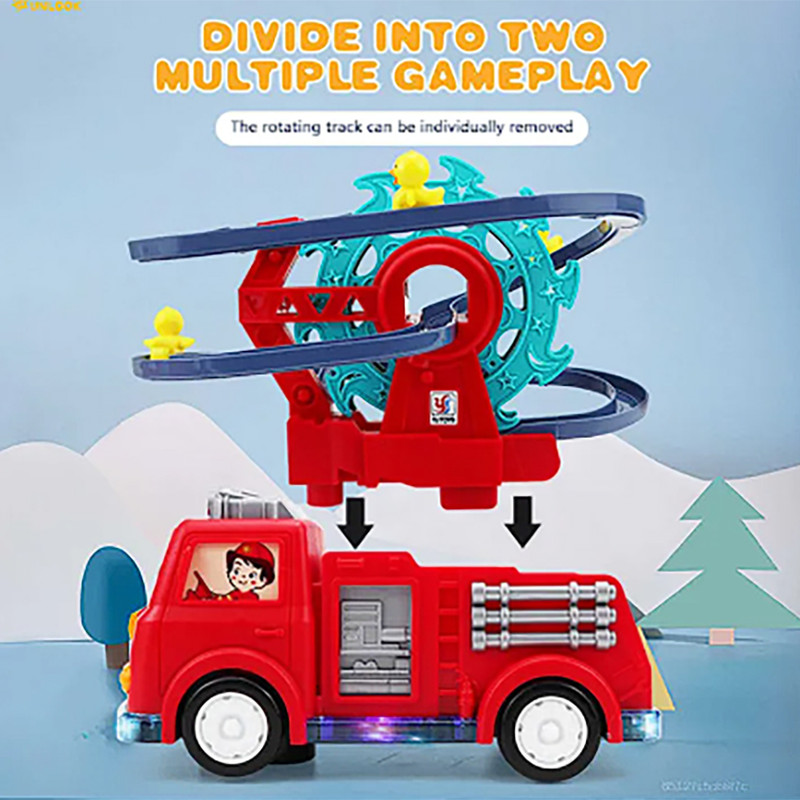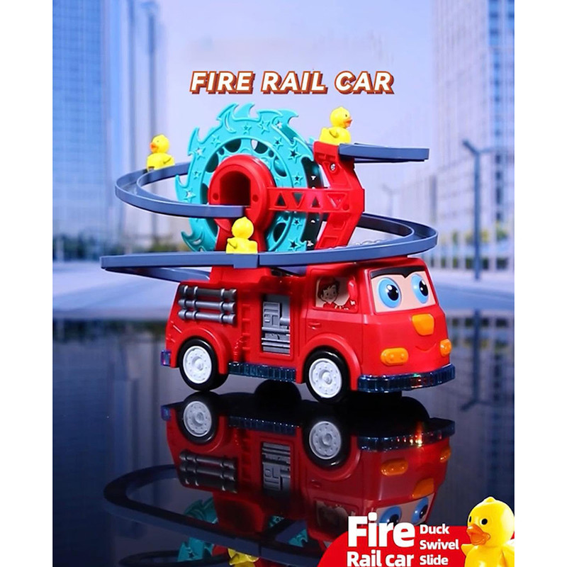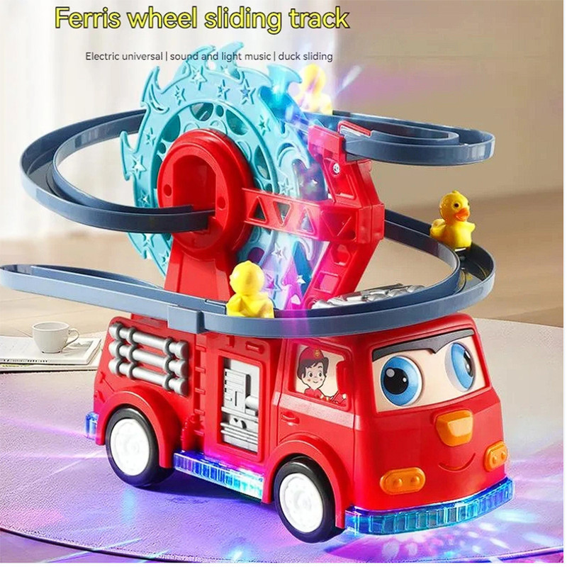 این محصول یک ماشین پله در طرح ماشین آتش نشانی می باشد که چندین عروسک اردک در مسیری که روی ماشین به صورت سرسره وجود دارد نصب می شود و اردک ها به صورت خودکار از پله ها بالا آمده و در مسیر سرسره حرکت می کنند و دوباره به نقطه اولیه بازمیگردند.این ماشین دارای چرخی در زیر ماشین است که که قابلیت چرخش 360 درجه دارد و هنگام برخورد با موانع تغییر مسیر می دهد.از دیگر ویژگی های این محصول نورپردازی سه بعدی و موسیقی متنوع، است که توجه کودکان را جلب کرده و آنها را مجذوب خود میکند.دیگر ویژگی این محصول حرکت کردن چشم های جلوی ماشین به هنگام روشن کردن می باشد.این محصول با داشتن بسته بندی مناسب برای کودکان بالای 3 سال می باشد و می تواند هدیه ای زیبا و جذاب برای کودکان عزیز شما باشد.