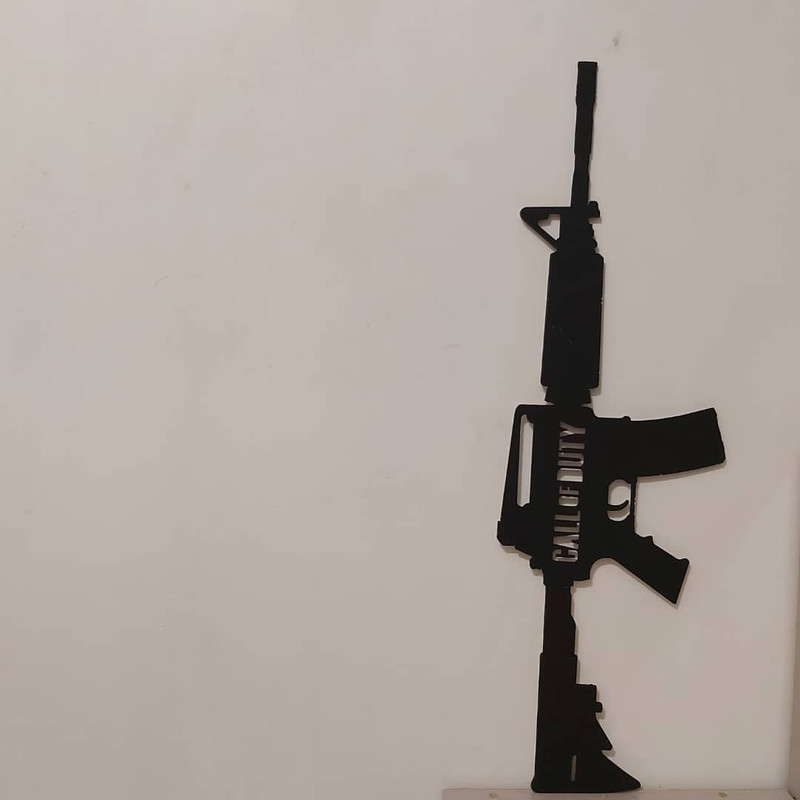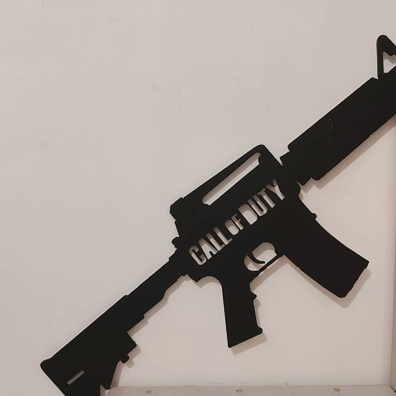 این استیکر از جنس ام دی اف دولایه درست شده است.رنگ مشکی مات زیبایی خاصی به آن داده است.برای طراحی و ساخت آن از اسلحه های بازی کال آف دیوتی الهام گرفته شده است و با نصب در اتاق کودک و نوجوان و یا فروشگاهها و مراکز بازی کامپیوتری، میتوان به فضای محل ، حال و هوای دیگری داد.برای نصب آن در روی دیوار و یا کمد ، چسب دولایه در نظر گرفته شده است.
