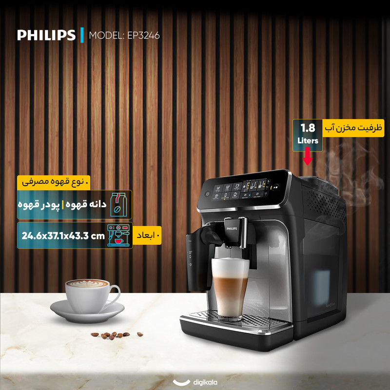 اسپرسو ساز فیلیپس مدل EP3246، وسیله ای تمام اتوماتیک از سری 3200 فیلیپس است که با نمای ظاهری خیره کننده و عملکردهای منحصر به فردی ارائه شده و بسیاری از دوستداران قهوه را مجذوب خود کرده. راه اندازی دستگاه بسیار آسان بوده و به لطف قدرت 1500 وات، دستگاه ظرف مدت کوتاهی آماده استفاده می گردد. بدنه پلاستیکی بادوام و صفحه نمایش لمسی از برجسته ترین ویژگی های این مدل محسوب می شود که در نوع خود بی نظیر است.