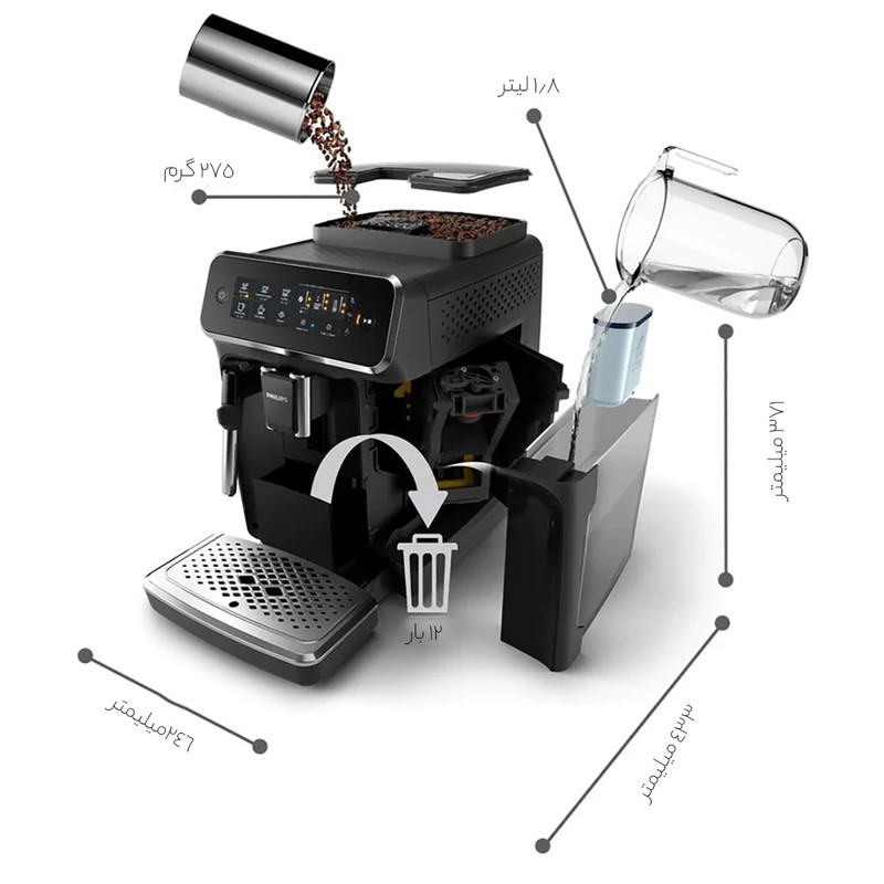 | سایر توضیحات | دارای فیلتر آب AquqClean / امکان تنظیم دما در 3 سطح / آماده سازی 2 فنجان در هر مرحله / امکان 3 تنظیم برای قدرت رایحه / دسترسی آسان به تنظیمات کاربری / مجهز به سیستم ECO جهت کاهش مصرف انرژی / مجهز به سیستم Aroma Extract با حفظ دمای آب بین 90 تا 98 درجه سانتی گراد / قابلیت آسیاب قهوه در 12 حالت مختلف |