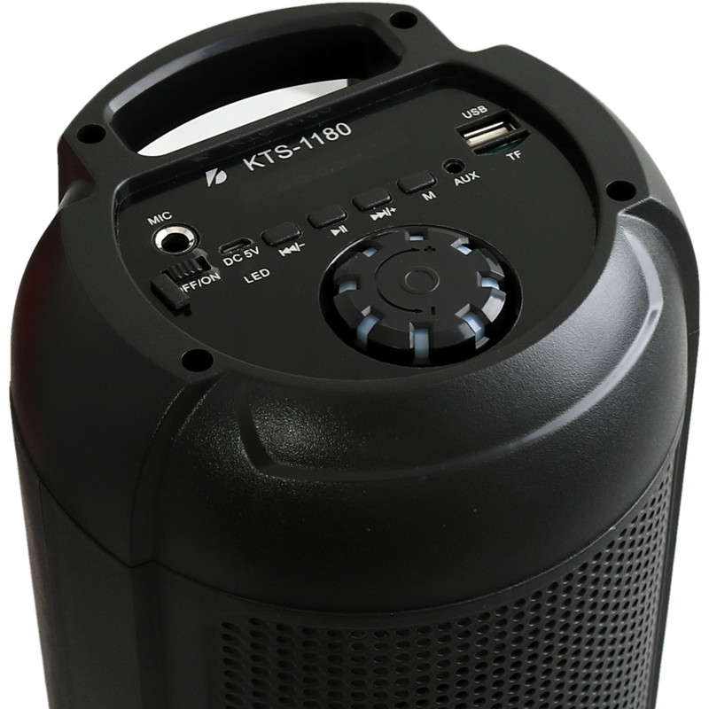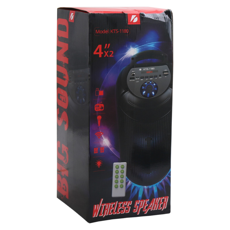 اسپیکر پرتابل KTS 1180 را می توان به شکل ایستاده به کار برد و علاوه بر بلوتوث، با کارت حافظه، فلش مموری و AUX سازگاری دارد. اسپیکر بیسیم KTS مدل 1180 حتی به ورودی میکروفون نیز مجهز شده است و همچنین وجود دو ساب 4 اینچی باعث شده است تا بتوانید قدرت صدای شگفت انگیز آن را برای تمرین آواز نیز به کار ببرید. ویژگی شگفت انگیز دیگر این اسپیکر، وجود رقص نوررنگی در هنگام پخش موزیک است. تفاوت رقص نور این اسپیکر ب سایر نمونه های بازار این است که نور از قسمت شیشه ای و شفافی که پایین اسپیکر طراحی شده است پخش میشود که جذابیت این اسپیکر را بیشتر میکند. از ویژگیهای دیگر اسپیکر وایرلس کی تی اس مدل 1180 میتوان به رادیوی FM، برد 10 متری، ریموت کنترل و پخش صدای استریو اشاره کرد.