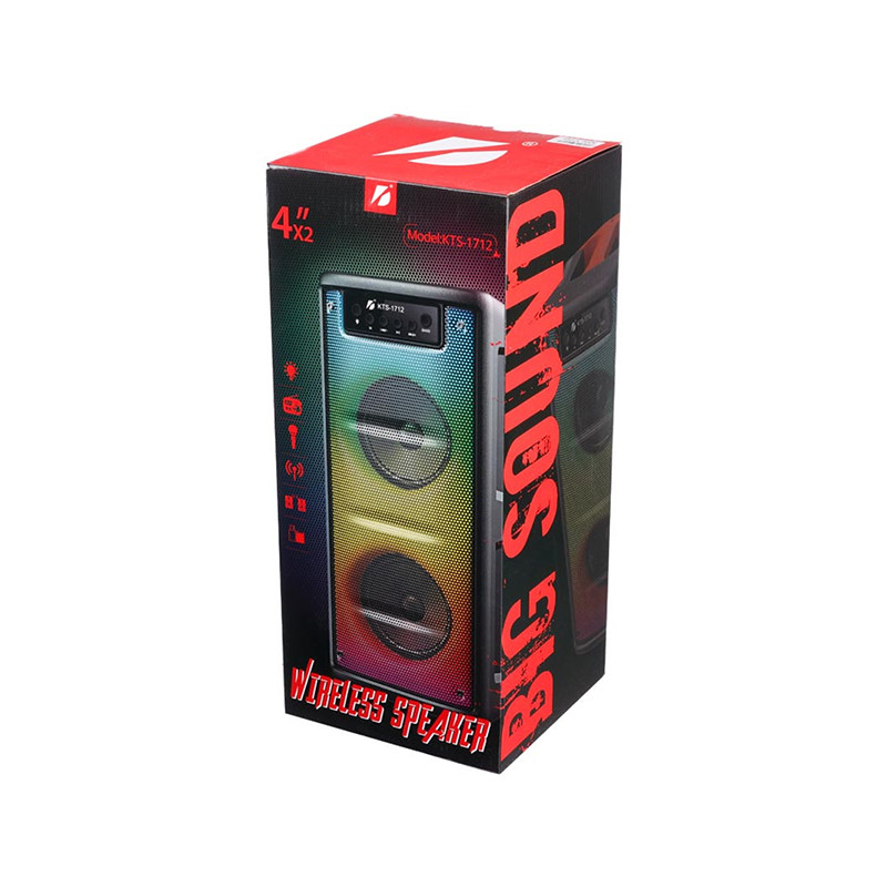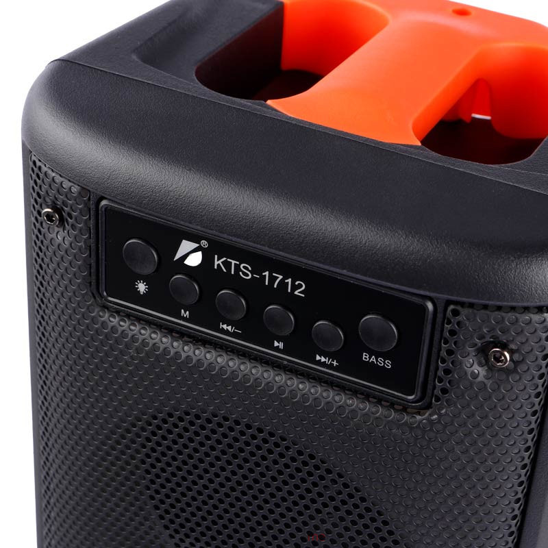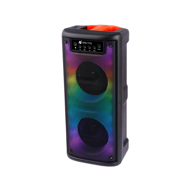 اسپیکر بلوتوث قابل حمل KTS با ظاهر شیک و زیبا می تواند انتخاب خوبی برای گوش دادن و لذت بردن از موزیک دلخواهتان باشد. این اسپیکر دارای دو باند 4 اینچی و دارای رقص نور RGB می باشد که هنگام پخش موزیک زیبایی چندانی به اسپیکر میدهد. پشتیبانی از کارت حافظه و فلش مموری ، بلوتوث ، ورودی AUX و قابلیت اتصال میکروفن از ویژگی های این اسپیکر قدرتمند می باشد. بدنه ساخته شده از جنس پلاستیک ABS مقاوم در برابر آسیب های فیزیکی همچون ضربه و فشار و دارای دسته جهت سهولت در حمل و نقل است؛ تامین انرژی این اسپیکر از طریق باتری داخلی به ظرفیت 1800 میلی آمپر ساعت با قابلیت شارژ مجدد از طریق درگاه شارژ میکرو یو اس است. این دستگاه قابلیت اتصال میکرون را داراست. نوع اتصال اسپیکر بی سیم و از طریق بلوتوث با برد 10 متر و با سیم توسط رابط جک 3.5 میلی متری صدا، حافظه USB، کارت حافظه microSD و دریافت امواج رادیویی FM می باشد. میزان ولتاژ ورودی اسپیکر KTS مدل 1712 برابر با 5 ولت و شارژدهی در حدود 2 الی 3 ساعت با ولوم 70 درصد می باشد. این اسپیکر با برخورداری از کلید های فیزیکی جهت مدیریت موسیقی، خاموش / روشن، تغییر حالت و تنظیم صدا استفاده را برای شما آسان تر می کند. پشتیبانی از نورپردازی RGB و قابلیت TWS جهت اتصال دو یا چند دستگاه به یکدیگر، پاسخ فرکانسی 100 هرتز الی 20 کیلوهرتز و حساسیت سیگنال به نویز 85 دسی بل از دیگر ویژگی های اسپیکر KTS مدل 1712 است.