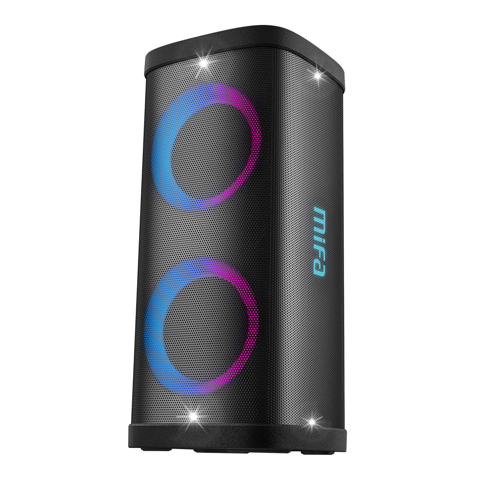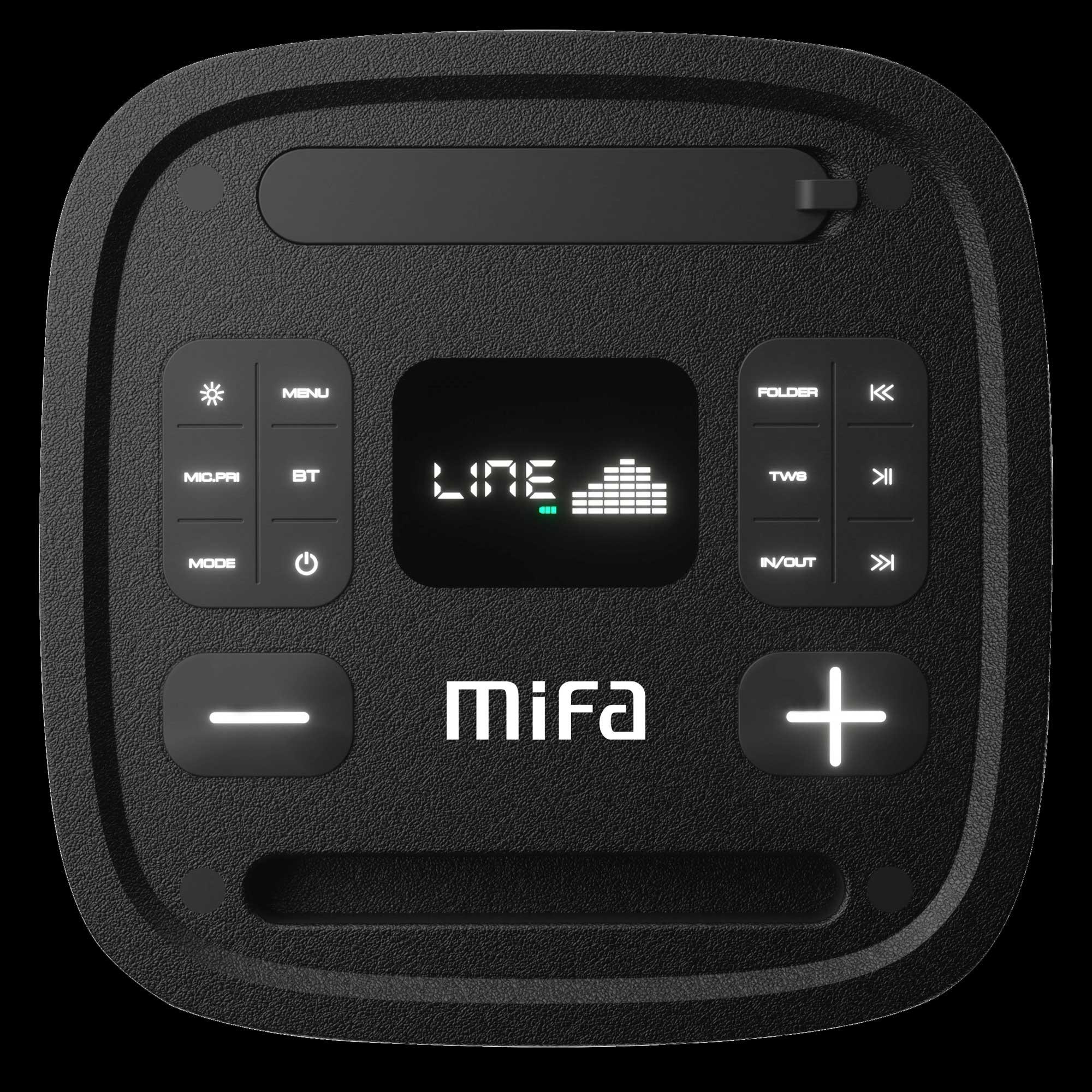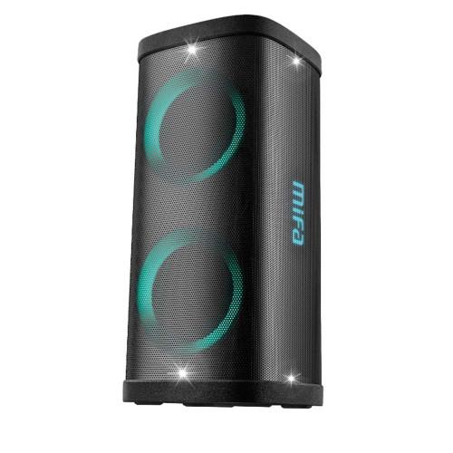اسپیکر بلوتوثی میفا Mifa MT660 Bluetooth Speaker مشخصات کلی تکنولوژی TWS (True Wireless Stereo) نور پردازی دو دایره چراغ LED توییتر 6.5 اینچی x2 + 2.5 اینچی x2 صدا قدرتمند با 40 وات RMS 7.4 باتری قابل شارژ با ولتاژ 7.4 ولت تقویتکننده 2 پانل جانبی با ولتاژ 7.4 ولت/ 3600 میلی آمپر دسته بندی محصول : پخش کننده موسیقی بلوتوثی ابعاد : 269x290x626 میلی متر وزن : ۸.۶ کیلو گرم ووفر : دو عدد ووفر ۶.۵ اینچ توئیتر : دو عدد توئیتر ۲.۵ اینچ نوع اتصال : بلوتوث – درگاه کارت حافظه AUX – TF – حافظه فلش USB دارای رادیو FM دارای پنل در بالا همراه با نمایشگر LCD مجهز یه کنترل ولوم میکروفن/اکو/بیس/تریبل دارای دو ورودی میکروفن قابل حمل و دارای دستگیره حمل رنگ : مشکی بلوتوث : دارد ورژن بلوتوث : ۵.۳ AUX: دارد USB : دارد توان خروجی : ۴۰ وات باتری : دارد نوع باتری : لیتیوم ion قابل شارژ ظرفیت باتری : ۷.4V/3600mAh قابلیت پشتیبانی از کارت حافظه : دارد اقلام همراه : یک عدد دستگاه MT660 ، ریموت کنترل ، یک عدد میکروفن UHF ، یک عدد کابل برق ، کیف حمل اسپیکر ، دفترچه راهنما