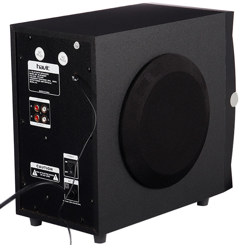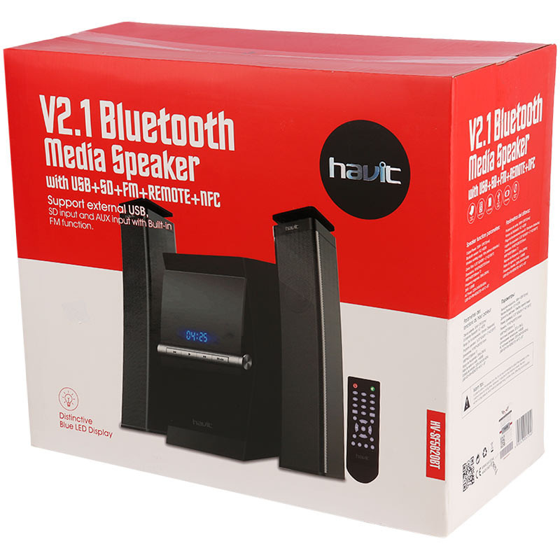 ساندبار هویت مدل HV-SF5620BT همراه با اسپیکر دو تکه با بهره مندی از ساندبار با درایور 5.25 اینچ و دو اسپیکر با درایو 3 اینچی، میزان توان کلی ساندبار 40 وات به علاوه اسپیکر با توان 30 وات (2*15W) ، محدوده پاسخ فرکانسی 20 هرتز الی 20 کیلوهرتز، امپدانس ساندبار 8 اهم و اسپیکر 4 اهم و میزان نسبت ، سیگنال به نویز برابر با 80 دسی بل ، دارای بدنه ساخته شده از پلاستیک، نوع اتصال با سیم از طریق رابط RCA و بی سیم توسط بلوتوث نسخه 2.1 با برد اتصال مفید 10 متر ، مجهز به ریموت کنترل جهت مدیریت صوتی، تغییر مود و خاموش / روشن کردن دستگاه و ... ، برخورداری از پورت فلش مموری USB و اسلات کارت حافظه SD و NFC ، دارای رادیو FM، محدوده فرکانس ورودی 50 الی 60 هرتز است.