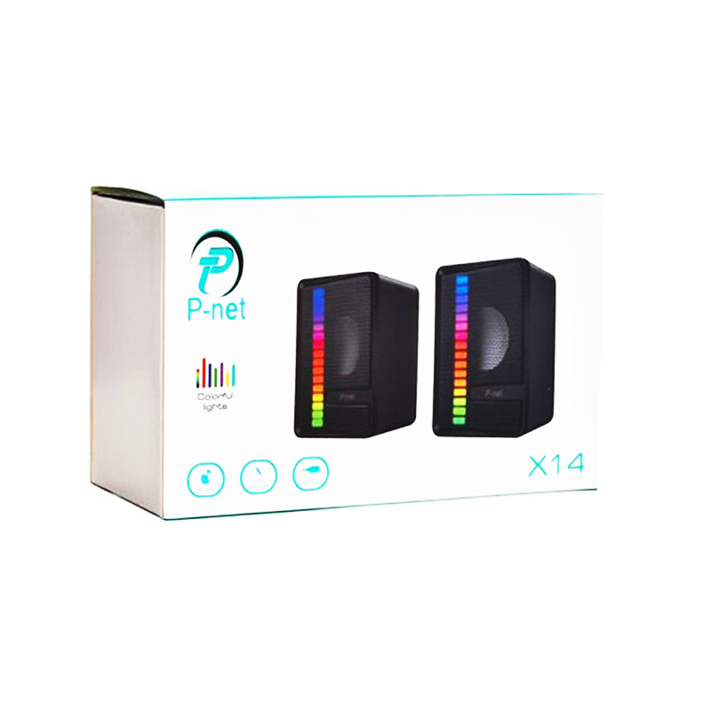 اسپیکر P-net مدل X14 یک محصول سیمی در ابعاد جمع و جور می باشد که برای متصل شدن به رایانه و لپ تاپ مناسب می باشد. این اسپیکر از یک کابل دوسر تشکیل شده است که یک سر آن جک 3.5 میلی متری برای وصل شدن پورت های صدا و آن سر دیگر یک رابط USB به منظور تامین برق می باشد. این محصول با اکثر سیستم عامل های ویندوز، انواع نوت بوک، آیپد و آیفون ها، Mp3 پلیر ها و غیره سازگاری دارد. بر روی اسپیکر دوتکه پی نت مدل X14، کلیدی برای تنظیم صدا تعبیه شده است که می توان آن را کم و زیاد نمود. این محصول دارای نورپردازی و متغیر RGB است. این اسپیکر را می توان در خانه، محل کار، مغازه، کافی شاپ و رستورانها و همچنین کلاسهای آموزشی به کار گرفت.