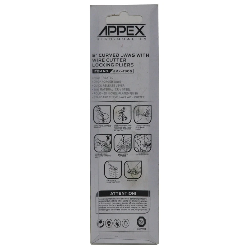 انبر قفلی اپکس مدلAJ-APX-1905سایز 5 اینچ ابزاری بسیارقوی و در عین حال پرکاربرد است که برای گرفتن و نگه داشتن قطعات مختلف (اکثراً با سایز بزرگ) مورد استفاده قرار میگیرد.در واقعیت، انبر قفلی 7اینچ اپکس یک گیرهی متحرک قابل حمل است. این انبر قفلی از دو فکّ منحنی شکل و دندانههای تقویت شده تشکیل شده است،تا ضمانت دهد که هر شی و هر محصولی با هر نوع شکلی را میتواند بدون لغزش نکه دارد.