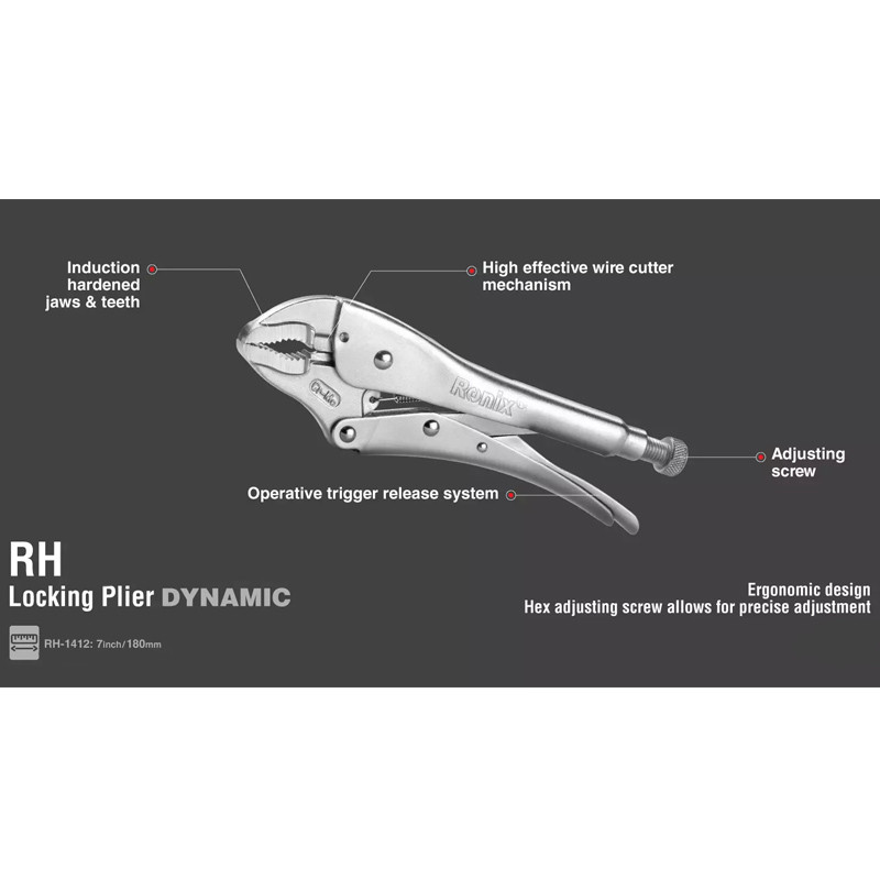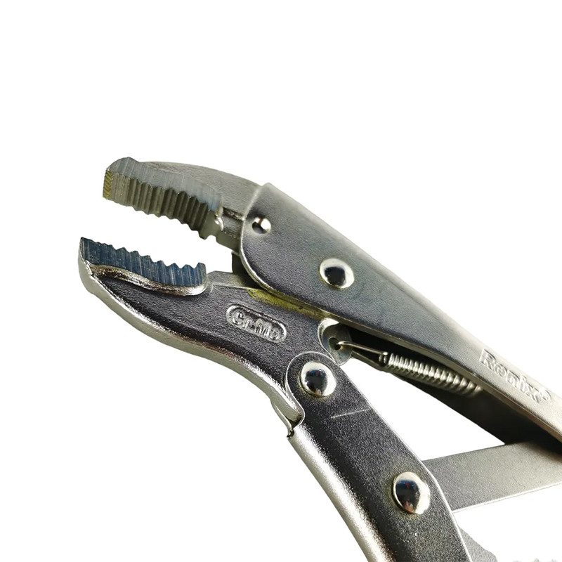 فکها در انبر قفلی رونیکس مدل 1412 سایز 7 اینچ، منحنیشکل و سختکاریشده هستند و مطابق با استاندارد DIN ساخته شدهاند که مقاومت سایشی و قدرت گیرایی این ابزار را دوچندان کرده و به ثابت نگهداشتن قطعه کار کمک میکنند. سیستم قفلکن ماشه انبر، قدرت زیادی برای ثابت نگه داشتن قطعه کار به شما خواهد داد.