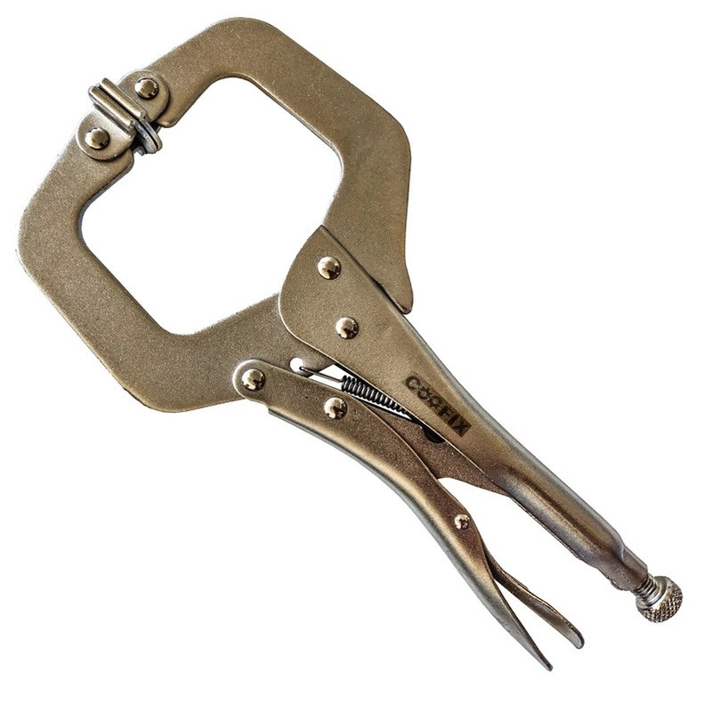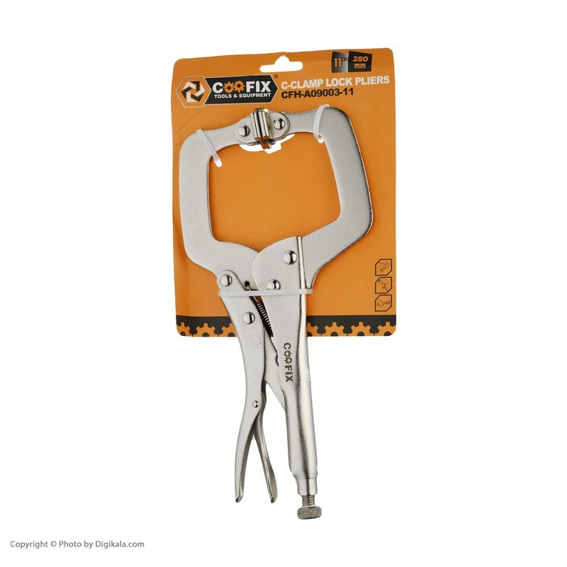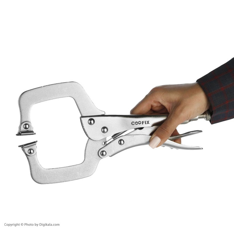دارای صفحات متحرک در نوک فک ها جهت منطبق نمودن سطوح قطعه کار-فک ها از جنس فولاد سخت کاری شده-دارای پوشش ضد زنگ – وزن: 840 گرم-ابعاد بسته بندی: طول: 37 ، عرض: 17 ، ضخامت: 3 سانتیمتر انبر قفلی هماهنگ شونده C شکل کوفیکس انبر قفلی نوعی ابزار است که می توان فاصله بین دو فک آن را توسط پیچی که در انتهای دسته قرار دارد تنظیم و سپس آن را قفل کرد . این انبر ها دارای دو فک هستند که یکی ثابت و دیگری قابل تنظیم است . موارد کاربرد انبرقفلی هماهنگ شونده کوفیکس عبارتند از : ثابت نگه داشتن و گرفتن مهره و سرپیچ به عنوان آچار ثابت نگه داشتن لوله به عنوان آچار لوله گیر نگه داشتن اشیا مانند انبر دست فشردن دو قطعه به یکدیگر مانند گیره از ویژگی ها و کار برد های این ابزار می توان به موارد زیر اشاره کرد : این مدل انبر قفلی همانند انبر قفلی C شکل بوده و تنها نقطه تمایز آن , داشتن صفحات متحرک در نوک فک هاست تا بتواند خود را با سطوح قطعات , منطبق نموده و بدون هیچ گونه اثرگذاری بر روی آن ها قفل شود . فک ها از جنس فولاد ابزاری و به روش آهنگری ( فورج ) تولید و کاملا سخت کاری می شوند . از مکانیزم قفل مناسب جهت اعمال فشار های بالا برای گرفتن قطعات برخوردار هستند . تمام قطعات دارای پوشش نیکل هستند .
