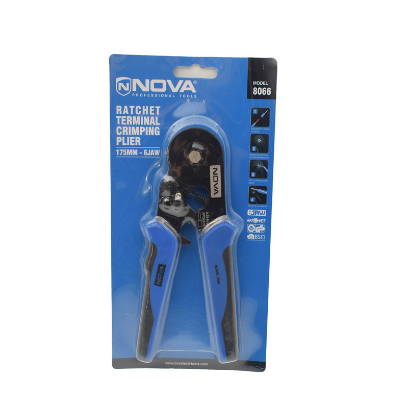 نووا یکی از بهترین شرکت ها در زمینه تولید ابزار می باشد این شرکت طی سالیانی که به تولید می پرداخته همچنان در این عرصه از پیشتازان می باشد .انبر پرس وایرشو شش گوش نووا مدل 8066 از محصولات نووا بوده که مناسب برای برقکاران میباشد.این ابزار نوعی انبر وایرشو است که جهت پرس سرسیم در رنجهای 0.25 الی 6 میلی متر مربع روی سیم مورداستفاده قرار میگیرد. از ویژگیهای مهم محصول فوق قابلیت جغجغه ای آن میباشد. فک آن فولادی بوده بوده و دسته آن از روکش پلاستیکی محکمی برخوردار است که به صورت ارگونومیک طراحی شده است. چهار پر بودن آن نیز موجب می شود تا سرعت انجام کار افزایش یابد . همچنین دستگاه فوق از وزن وابعاد مناسبی برخوردار بوده که کار با آن را آسان می نماید.