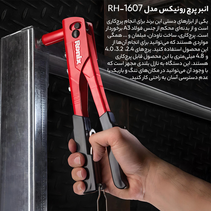 | سایر توضیحات | یک پرچ دستی شامل 4 سری قابل تعویض در سایزهای 2.4 ، 3.2 ، 4 و 4.8 میلی متر - طراحی شده برای کار با پرچهای 2.4 اینچ تا 4.8 میلیمتر مناسب برای انجام انواع پرچکاریها - دارای سیستم پرچ متمایز جهت پرچ هر چه سریعتر و دفع آسان اضافات میخ پرچ - دارای فنری مقاوم و دستهای با روکش PVC جهت افزایش دقت و استحکام پرچکاریها - دارای بدنهای تمام استیل با دوام و ماندگاری بالا - مجهز به نازلی بلند جهت انجام کار در مکانهای تنگ و باریک با دسترسی دشوار - ابزاری مناسب برای انجام پرچ کاریهای کلی، ساخت ناودان، مبلمان، بوم نقاشی و... - پرچی حرفهای که میتواند از هر سه نوع میخ پرچ آلومینیومی، فولادی و استیل استفاده کند - مجهز به دستهای ارگونومیک با روکش PVC ضدلغزش جهت افزایش سهولت کاربریهای طولانی مدت - طراحی منحصربفرد دسته جهت فراهم آوری نیروی کافی برای پرچ مهرههای مختلف |