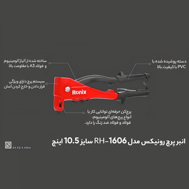 ابزار به سایز10.5 اینچ، محکم و بادوام از جنس آلیاژ آلومینیوم و فولاد A4 با استحکام بالا؛ دارای سیستم پرچ متمایز برای پرچ سریعتر و دفع آسان اضافات؛ مجهز به دسته ارگونومیک و ضد لغزش با روکش PVCو طراحی منحصربهفرد برای سهولت کاربری و تامین نیروی کافی برای پرچ مهرههای مختلف