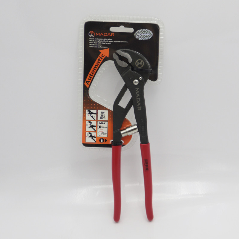 سایر توضیحات- انبر کلاغی مدار مدل اتوماتیک - سایز انبر : 10 اینچ ( 250 میلی متر ) - روی دسته کالا شاسی فنری تعبیه شده که با باز کردن دسته و قرار دادن روی مهره و جمع کردن دسته سری اتوماتیک جمع شده و مهره را میگیرد - عمل مهره گیری با باز و بست دسته نیازی به تنظیم دهنه کار نیست - دارای بدنه‌ی مستحکم و سختکاری شده - دارای دسته روکش دار ضد لغزش و ضد تعریق - دارای فک با دندانه‌های سختکاری شده - مقاوم در برابر سایش - دارای پوشش ضد زنگ - وزن : 360 گرم