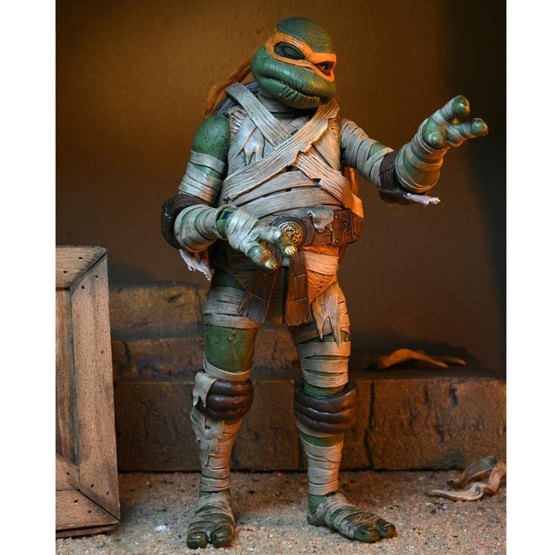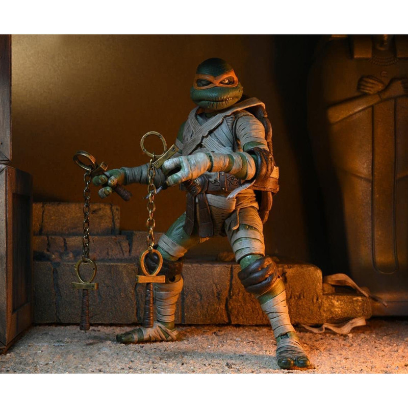 | سایر توضیحات | NECA بسیار هیجان زده است که افزوده جدیدی به مجموعه اکشن فیگورهای Universal Monsters x Teenage Mutant Ninja Turtles اعلام می کند. این خط به معروف ترین لاک پشت های جهان و نمادهای ترسناک یونیورسال ادای احترام می کند. میکل آنژ در نقش مومیایی، لاکپشت را بهعنوان مومیایی دوباره تجسم میکند، که از خواب ابدی خود با عشقی بیپایان… پیتزا بیدار شده است! با پای او دیر نکنید وگرنه ممکن است با The Mummy’s Curse مخالفت کنید! شامل دو نانچاک آنخ، سر و دست قابل تعویض، کبری قابل خم شدن، و پرده های بانداژ اضافی. در بسته بندی جعبه پنجره ای مناسب برای کلکسیونر با دریچه بازشو با تصویر سفارشی ارائه می شود. |