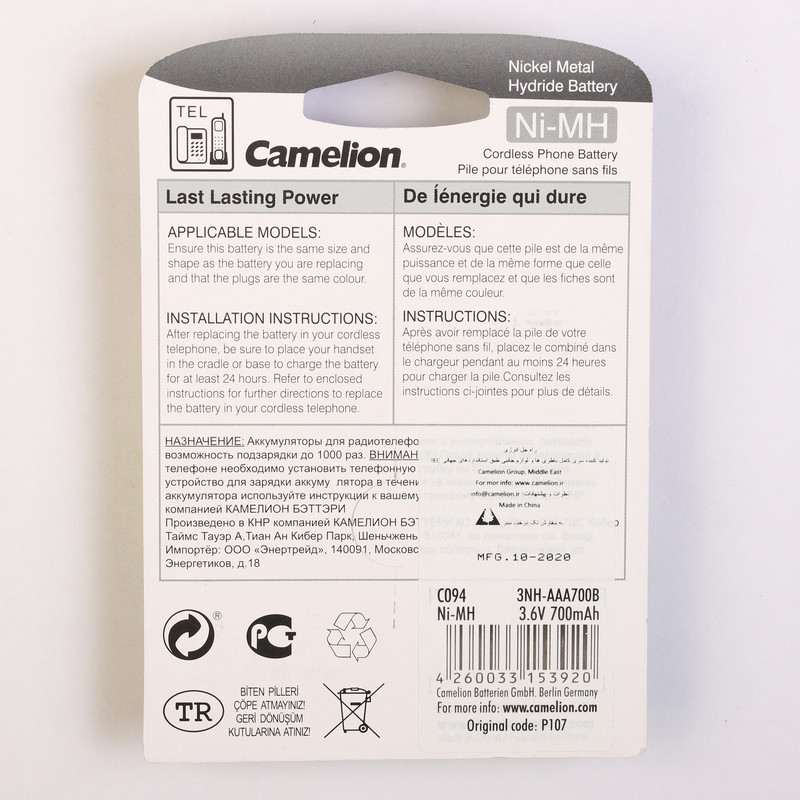 باطری تلفن بی سیم کملیون مدل «P107» از نوع Ni-MH بوده و در ولتاژ 3.6 عمل میکنند .تکنولوژی ساختی که در تولید این نوع باتری بهکاررفته ، نیکل متال هیدرید بوده و دارای پایداری انرژی الکتریکی و عمر مفید طولانی است. این مدل قابلیت شارژ مجدد دارد، پس طبیعتا میتوان پس از اتمام انرژی الکتریکی دوباره آن را شارژ و استفاده کرد.