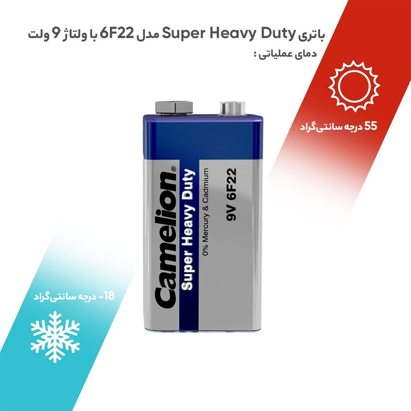 باتریهای ساخت شرکت کملیون معمولا از کیفیت قابلقبول و در عین حال قیمت مناسبی برخوردارند و برای استفاده در لوازم برقی ساده خانگی مناسب هستند. یکی از محصولات این شرکت باتری کتابی مدل 6F22 نام دارد که از طول عمر بالایی برخوردار است. این باتری از ولتاژ 9 ولت برخوردار است و میتوان از آن در ابزارهایی مانند چراغقوه، رادیو جیبی، اسباب بازی و غیره استفاده کرد. این باتری قابلیت شارژ مجدد نداشته و پس از اتمام شارژ دیگر کاربرد نخواهد داشت. البته دوام این سری از باتریهای کملیون بالا بوده و نیازی نیست آنها را در بازههای زمانی کوتاه تعویض کنید. البته طول عمر باتری بیشتر به نوع استفاده و میزان مصرف دستگاه برقی بستگی دارد، اما در مجموع سری Super Heavy Duty به نسبت قیمت مناسبی که دارد، کارایی خوبی از خود ارائه میدهد.