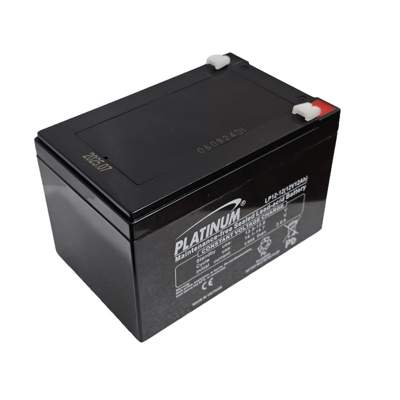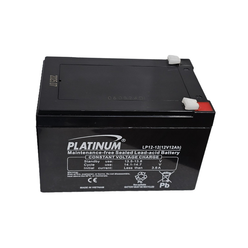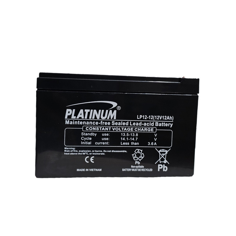 شرکت پلاتینیوم یک شرکت تولید کننده باتری است که باتری سیلد اسید قابل شارژ برای سیستم های برق اضطراری یو پی اس و ماشین شارژی و سایر مصارف باتری های سیلد اسید تولید می کند. باتری 12 ولت 12 آمپر مناسب ماشین شارژی و ups است. لازم به توضیح است این باتری ها ساخت کشور ویتنام میباشد. مصارف این باتری در ماشین های شارژی اسباب بازی های شارژی دوچرخه شارژی اسکوتر برقی برق اضطراری و چراغ های صنعتی و UPS و ... می باشد. برای افزایش طول عمر این نوع باتری ها از لحیم کاری ترمینالهای باتری خودداری نمودهو هم چنین اگر به مدت طولانی از دستگاه خود استفاده نمی کنید باتری را از دستگاه جدا نمائید. وزن بالای این باتری