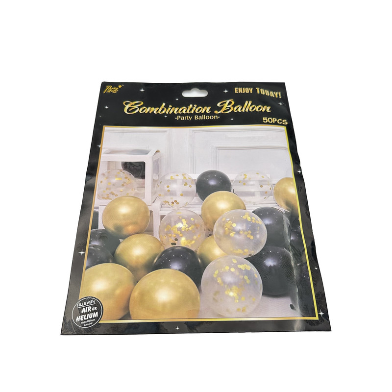 مجموعه بادکنک 50 عددی شامل بادکنک های مشکی - طلایی - شیری دارای پولک طلایی ، ساخت کشور چین می باشد. این مجموعه بادکنک قابلیت باد شدن با باد معمولی و هلیوم می باشد.