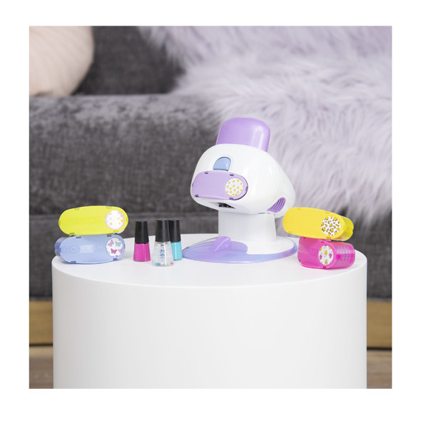 قابلیت منحصر به فرد این مجموعه وجود 5 طرح مختلف استمپ است که کودکان میتوانند به راحتی طرح های موجود را بر روی ناخنهای لاکزدهی دستها و پاها چاپ کنند ، فقط کافیست که انگشتان لاک زدهی خود را به نوبت داخل دستگاه قرار دهید و دکمهی بالایی رو فشار دهید . برای استفاده از این دستگاه باید از لاکهای مخصوصی که در بسته وجود دارد استفاده کرد ابتدا یکی از دو رنگ لاک را انتخاب کنید، بعد از چند لحظه تکان دادن ، یک لایهی نازک از لاک را روی ناخنهای خود بزنید. ویژگی جدید این استمپر این است که میتوانید با طرف دیگر این دستگاه لاکهای انگشتانتان را هم خشک کنید، با روشن کردن فَن بعد از گذشت 5 دقیقه لاکها خشک میشوند . اکنون میتوانید هر طرحی را که دوست دارید روی ناخن هایتان چاپ کنید ، به این صورت که یکی از 5 طرح را داخل دستگاه قرار دهید و اهرم بالایی رو محکم به مدت 2 ثانیه روی هر ناخن فشار بدهید و در انتها تاپ کُت را روی طرحهای ناخن بزنید تا دوام بیشتری داشته باشند در ضمن دستگاه فوق نیاز به 4 عدد باطری نیم قلمی دارد .