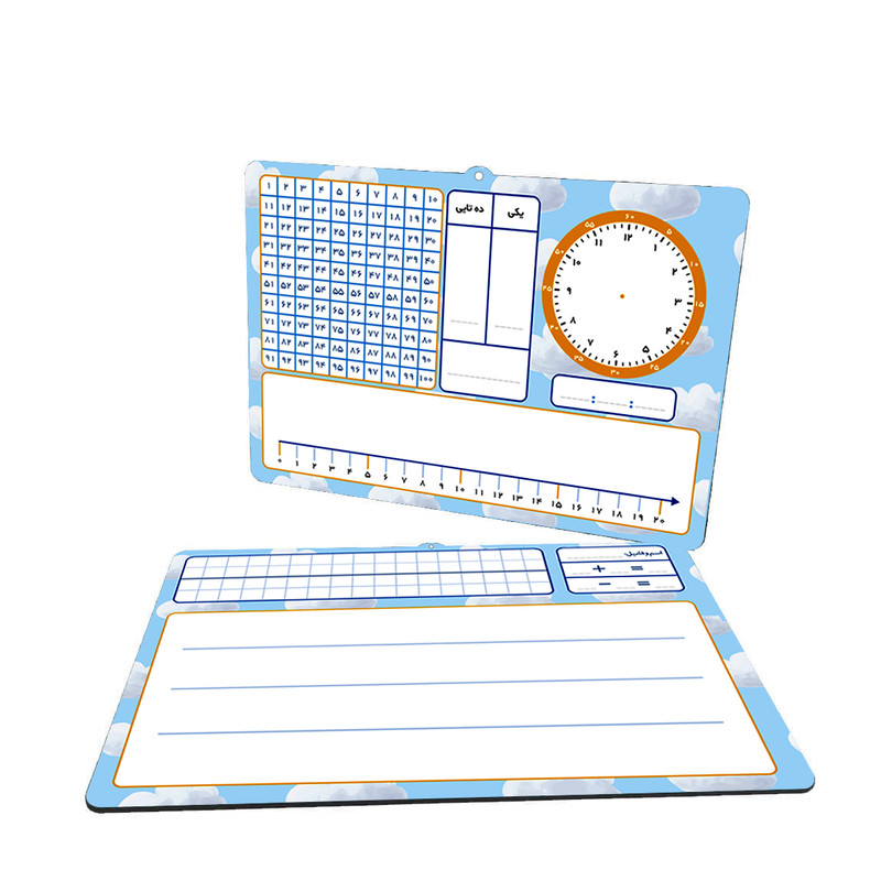 تخته ریاضی‌ کلاس اول یک تخته وایت‌بورد چوبی است که روی دو طرف آن تقریباً تمامی جداول و الگوهایی که برای دانش‌آموزان کلاس اول ابتدایی لازم است، از جمله یک محور اعداد، جدول اعداد 1 تا 100، جدول ارزش مکانی یکی و ده‌تایی، تساوی جمع و تفریق و تصویر یک ساعت بدون عقربه و دارای ارقام ساعت‌شمار و دقیقه‌شمار برای آموزش ساعت وجود دارد. با استفاده از این تخته، تجربه تمرین ریاضی به یک تجربه شیرین تبدیل می‌شود....