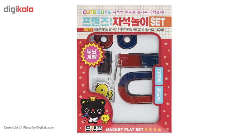 اقلام همراه - 1 عدد آهنربا تیغه‌ای - 1 عدد آهنربا نعلی شکل - 2 عدد اهنربا حلقه‌ای - 2 عدد گیره کاغذ - 1 قرقره نخ
