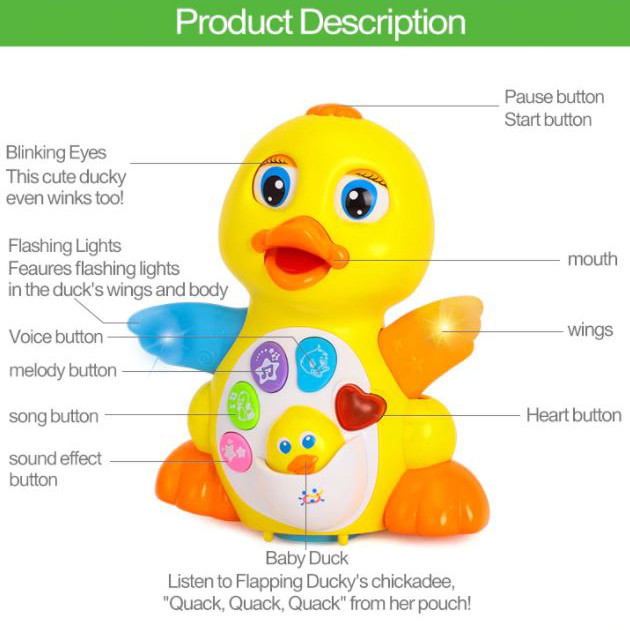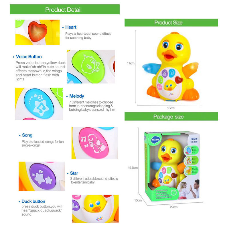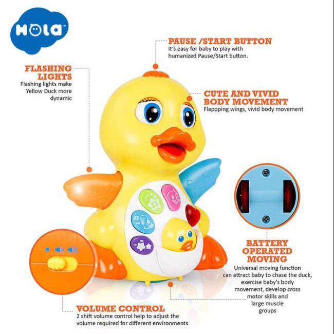اردک موزیکال برند هولا یک جوجه اسباب بازی با کارایی سرگرم کننده است. اگر دوست دارید اسباب بازی برای کودک کوچک خود تهیه کنید که سرگرم کننده باشد، موزیک بزند، حرکت کند و چراغ داشته باشد و با حرکات شگفت انگیز خود کودک را شاد کند حتما این اردک اسباب بازی نشکن گزینهای خوب برای خرید شما میباشد.این جوجه بانمک با سه باتری قلمی کار میکند و با روشن کردن آن و زدن ضربه به سرش شروع به حرکت میکند و میچرخد و موزیک پخش میکند.اردک در حال چرخیدن بالهایش را تکان می دهد و چراغ داخل بالها روشن و خاموش میشود. در همان حال چشمها و نوکش را باز و بسته می کند و آواز میخواند.این اسباب بازی سیسمونی نوزادی جذاب موزیکال اگر بجای برخورد کند مسیرش را عوض میکند. بسیار سرگرم کننده و برای کودک بسیار شادی آفرین است. بروی سینه جوجه کلیدهای برای پخش موزیکهای مختلف است و یک قلب که وقتی فشار بدهید صدای قلب میدهد. وقتی کلید جوجه را فشار دهید صدای جوجه میدهد.این جوجه موزیکال محصول کمپانی هویلی تویز (Huile Toys) است که امروزه با تغییر نام به هولا تویز محصولات خود را عرضه میکند و یک سازنده اسباب بازیهای کودکانه ایمن برای نوزادان و کودکان است. نشکن بودن، رنگ غیر شیمیایی بدون سرب و بدون هیچ گونه مواد سمی است. این اسباب بازی از مواد اولیه درجه یک تولید شده است و کیفیت فوقالعاده ای دارد و در تولید این محصول استانداردهای جهانی بخوبی رعایت شده است و یک اسباب بازی ایمن را برای کودکان به ارمغان آورده است.