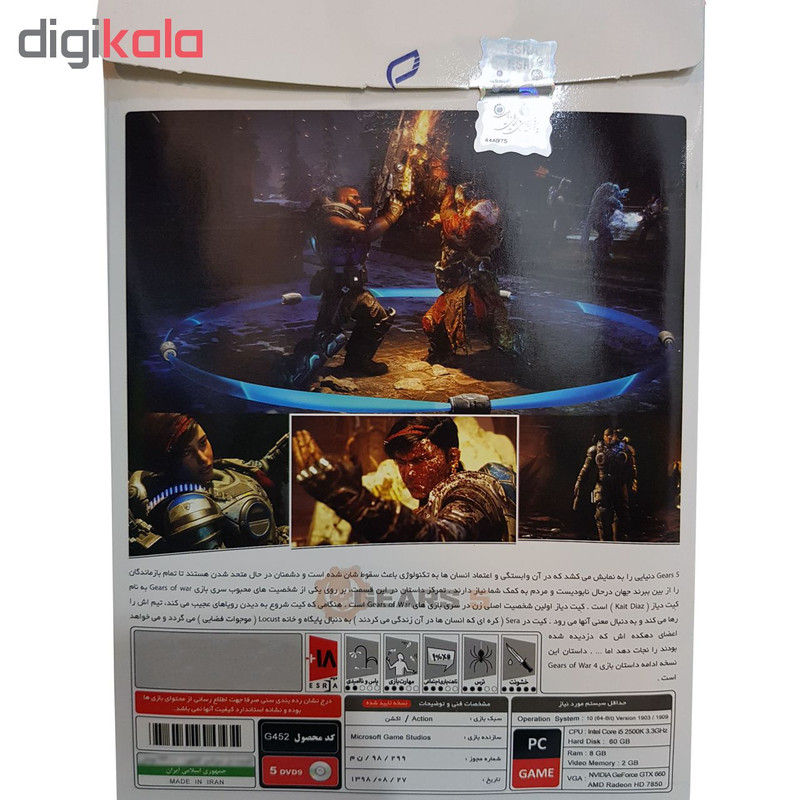 Gears 5 دنیایی را به نمایش می کشد که در آن وابستگی و اعتماد انسان ها به تکنولوژی باعث سقوط شان شده است و دشمنان در حال متحد شدن هستند تا تمام بازماندگان را از بین ببرند جهان درحال نابودیست و مردم به کمک شما نیاز دارند . تمرکز داستان در این قسمت، بر روی یکی از شخصیت های محبوب سری بازی Gears of war به نام کِیت دیاز ( Kait Diaz ) است . کِیت دیاز اولین شخصیت اصلی زن در سری بازی های Gears of War است . هنگامی که کیت شروع به دیدن رویاهای عجیب می کند، تیم اش را رها می کند و به دنبال معنی آنها می رود . کیت در Sera ( کره ای که انسان ها در آن زندگی می کردند ) به دنبال پایگاه و خانه Locust ( موجوات فضایی ) می گردد و می خواهد اعضای دهکده اش که دزدیده شده بودند را نجات دهد اما … . داستان این نسخه ادامه داستان بازی Gears of War 4 است .